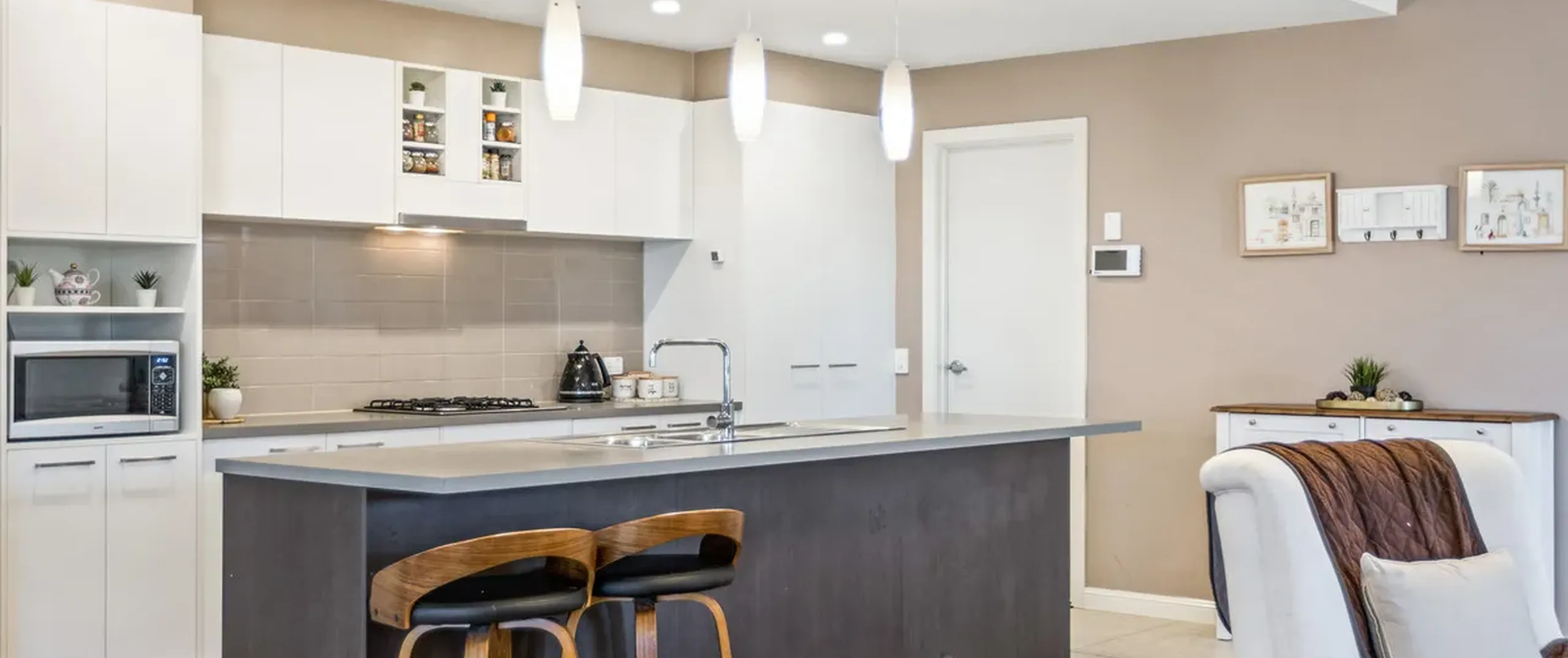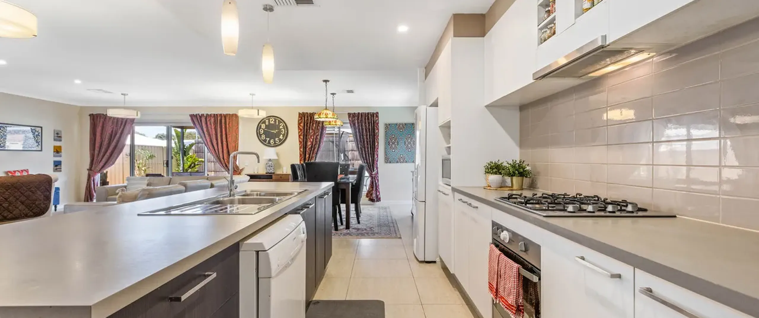 - Immaculate kitchen with gas cooktop, pantry, ample cupboard space and sweeping bench tops, complete with large island bench with breakfast bar and feature pendant lighting