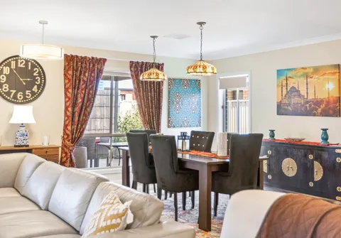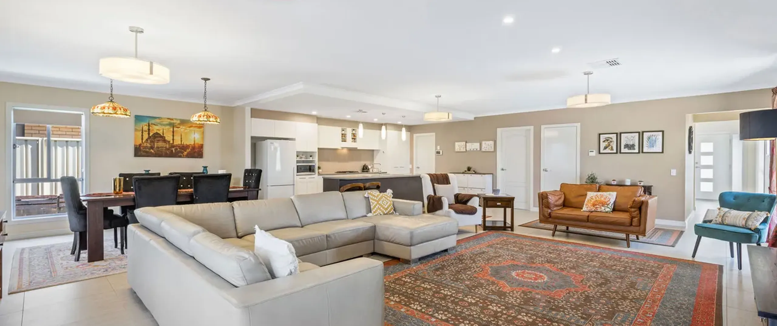 - Spacious open-plan living and dining area with double glass sliding doors flowing seamlessly through to the outdoor entertaining area