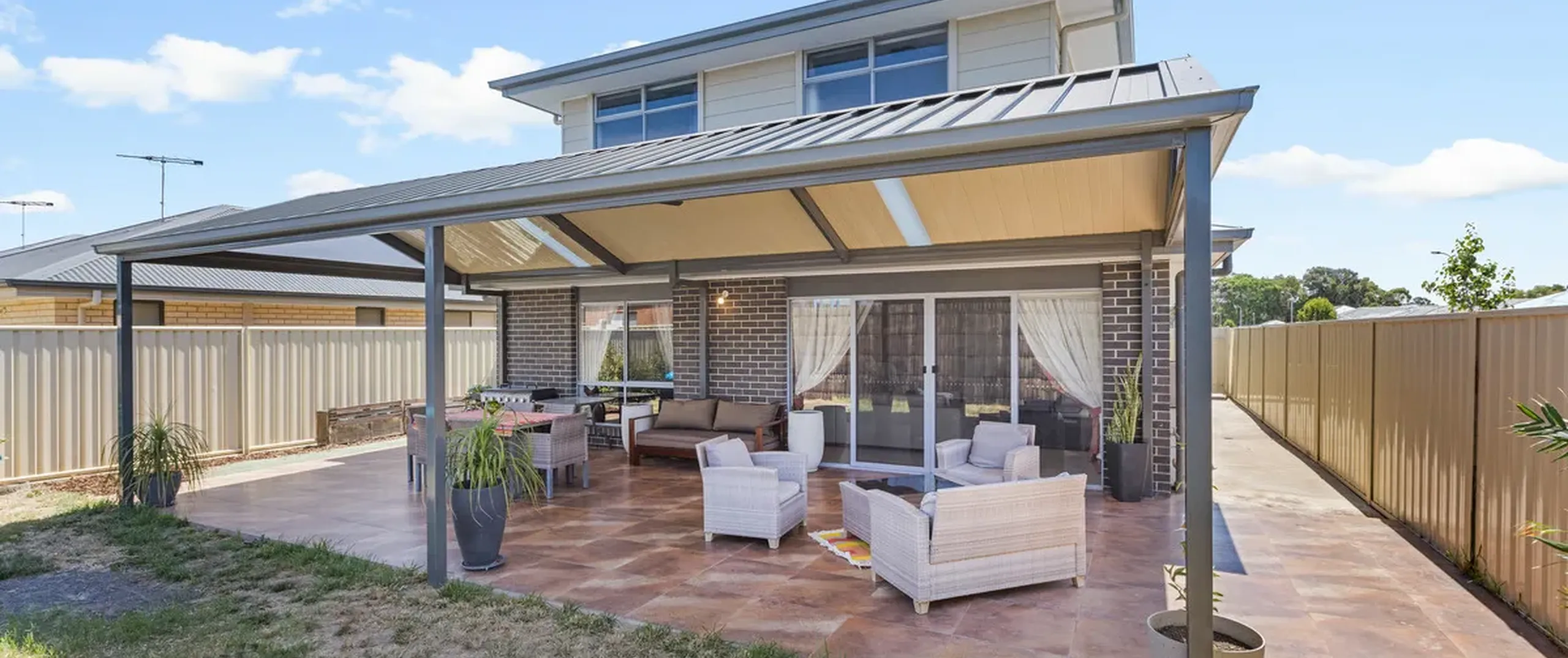 - Expansive outdoor entertaining area with pitched roof pergola and ceiling fan