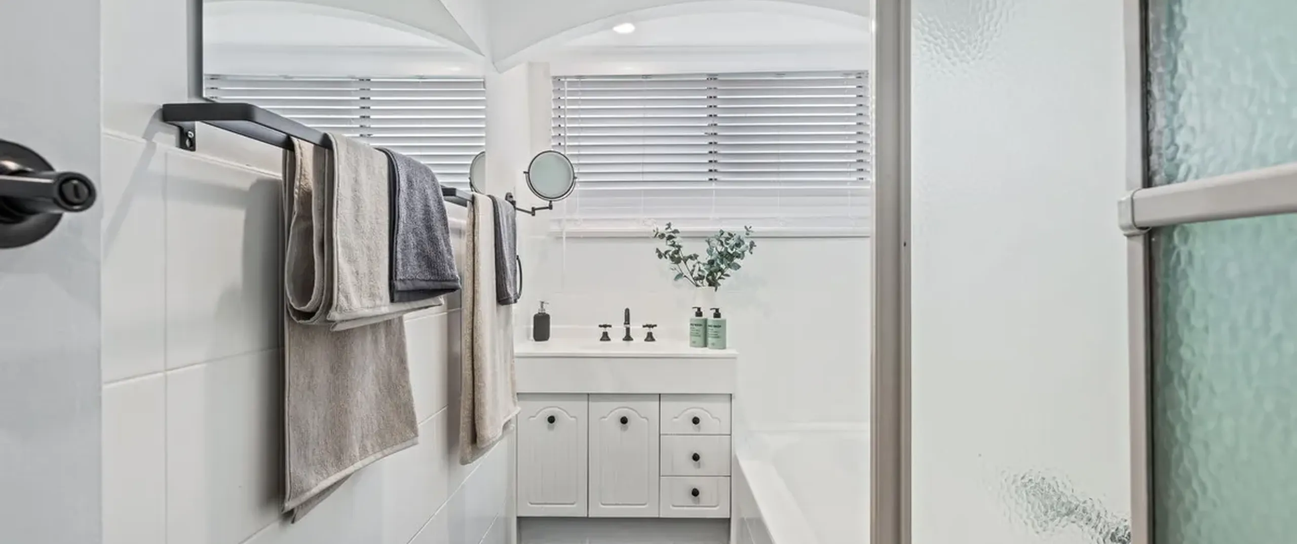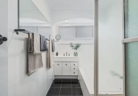 - Sparkling white on-trend bathroom with separate bath and shower