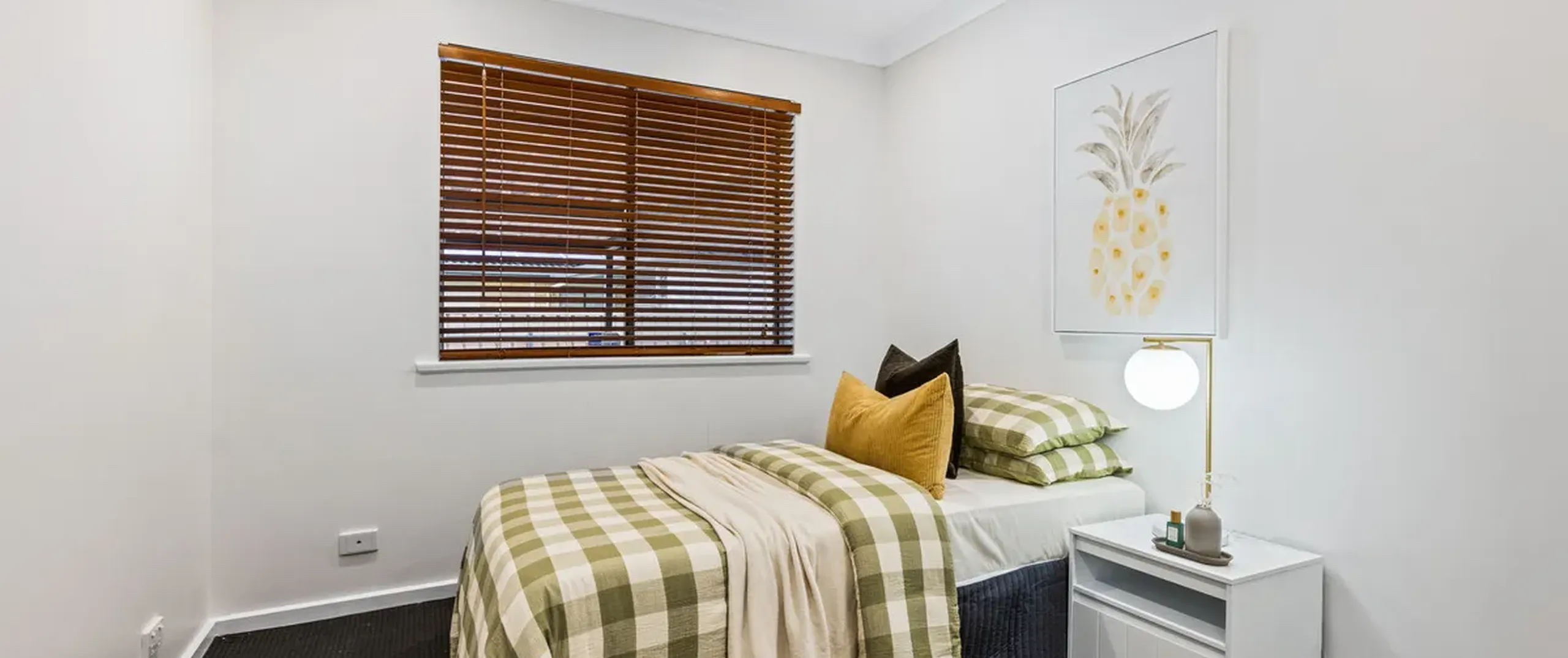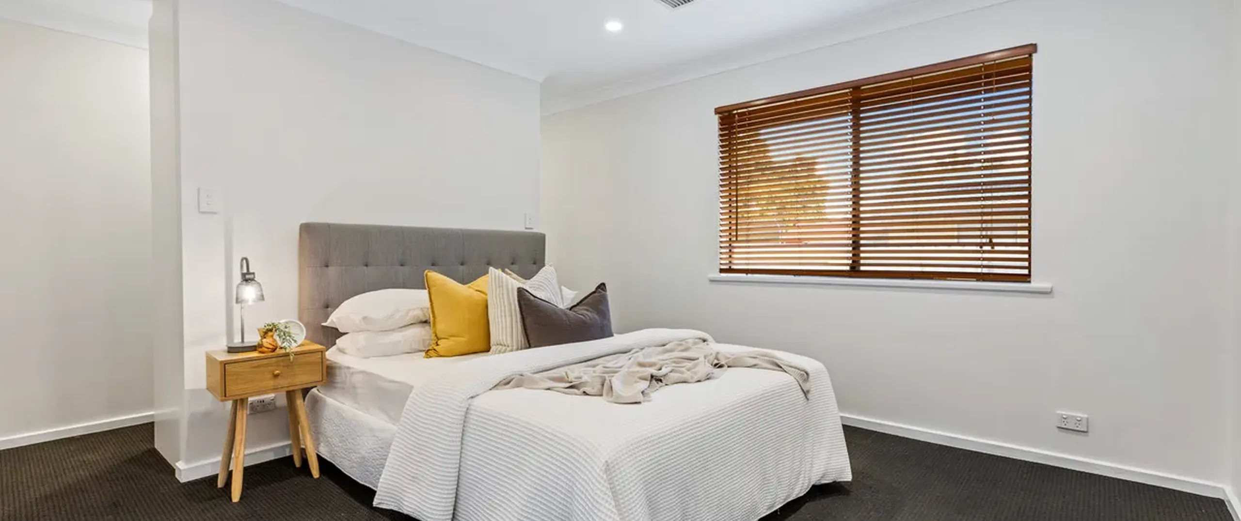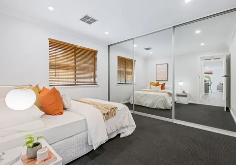 - Bright white master bedroom with walk-in robe