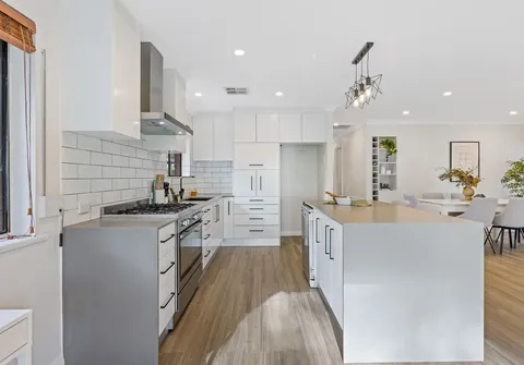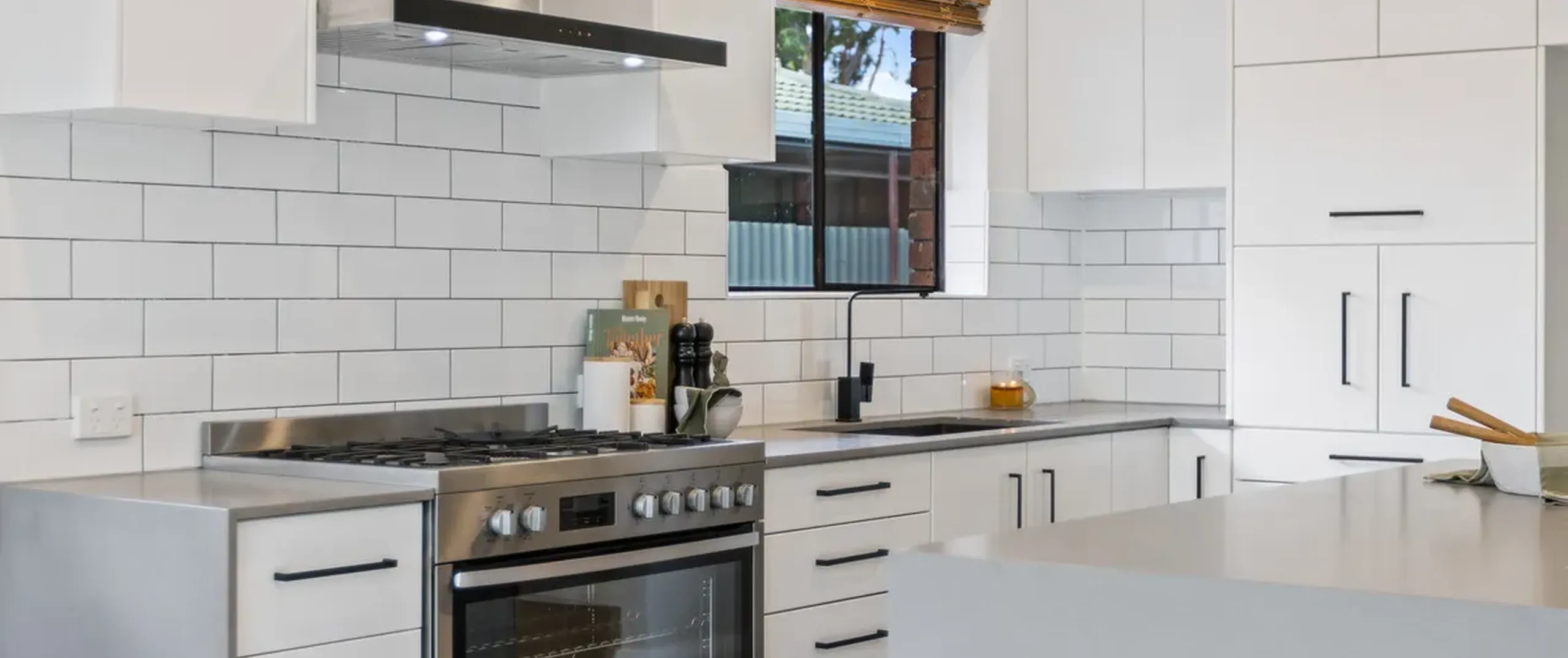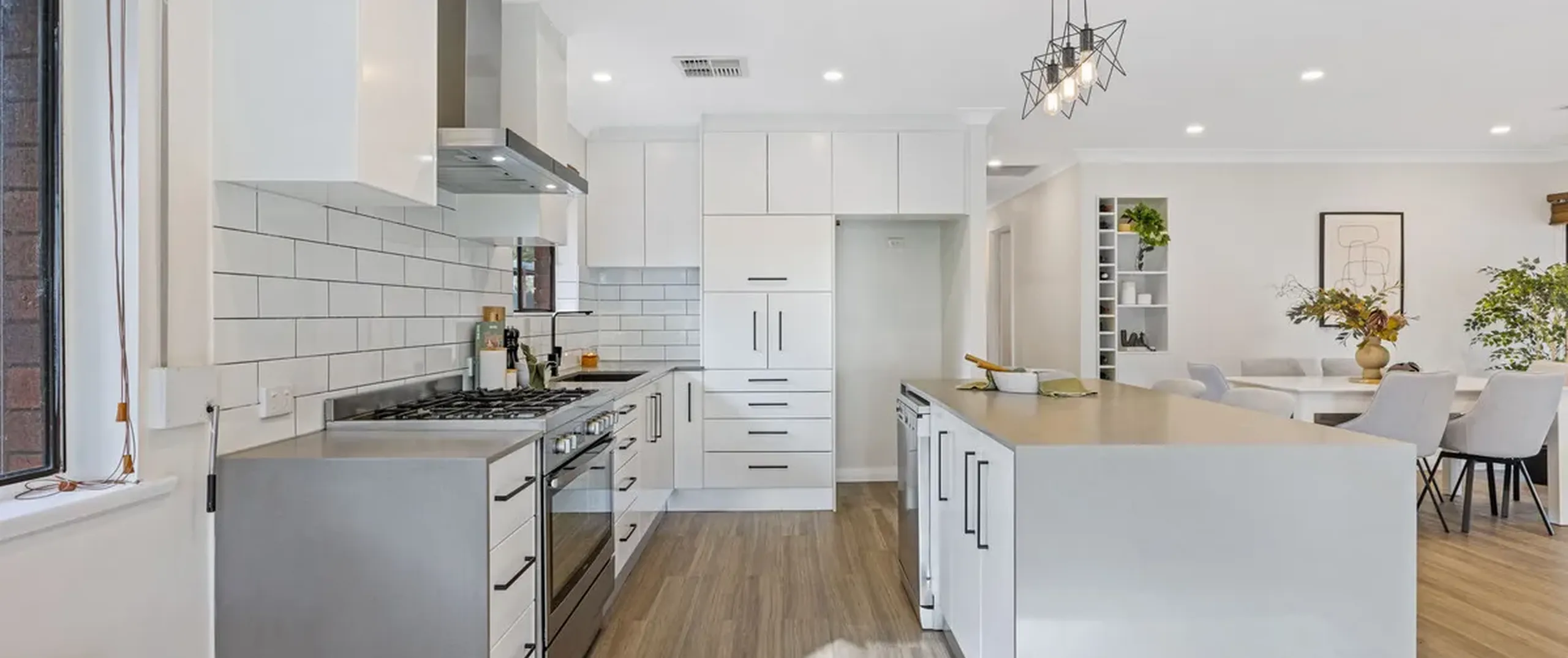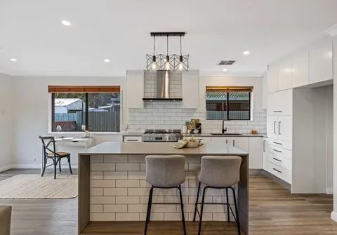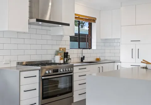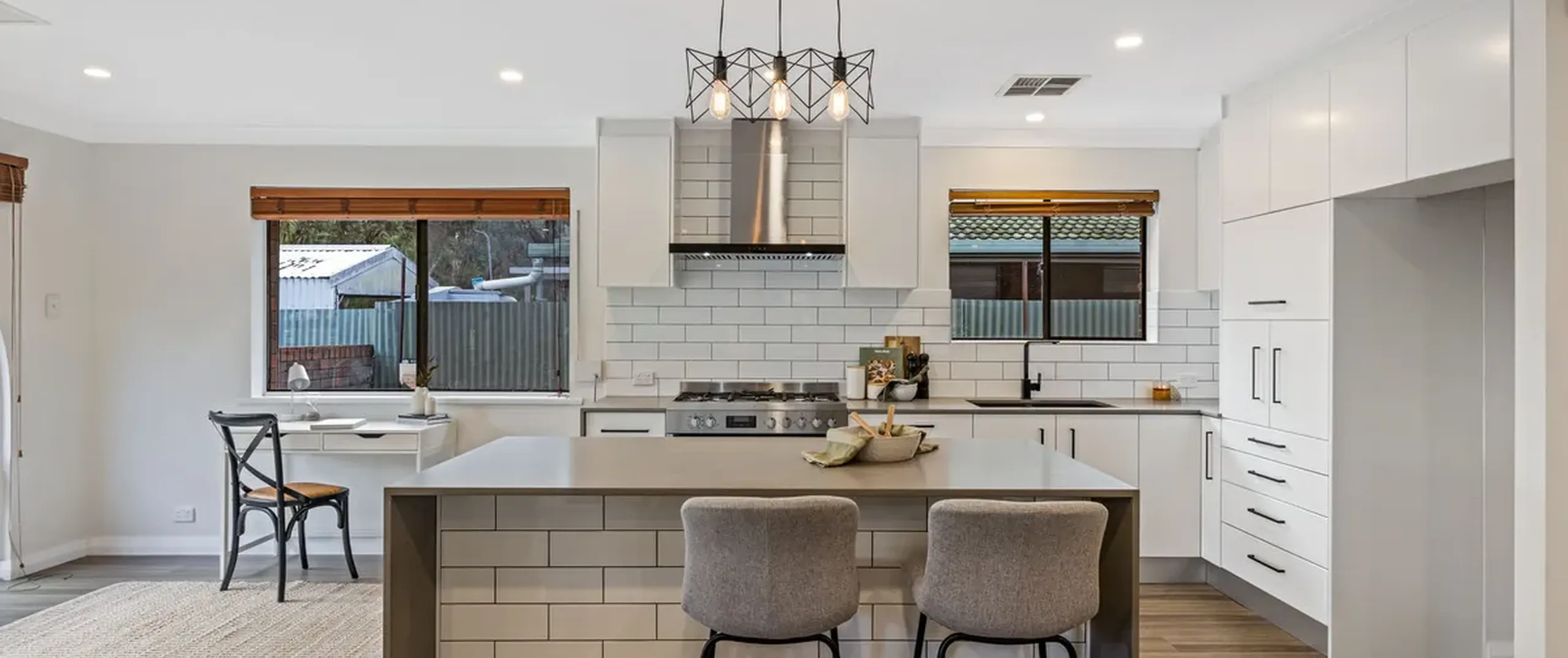 - Stylish updated kitchen with subway tile splash back, stainless steel 900mm gas cooktop and electric oven, pantry, stone benchtops, and large island with breakfast bar, perfect for food prep or busy mornings