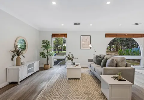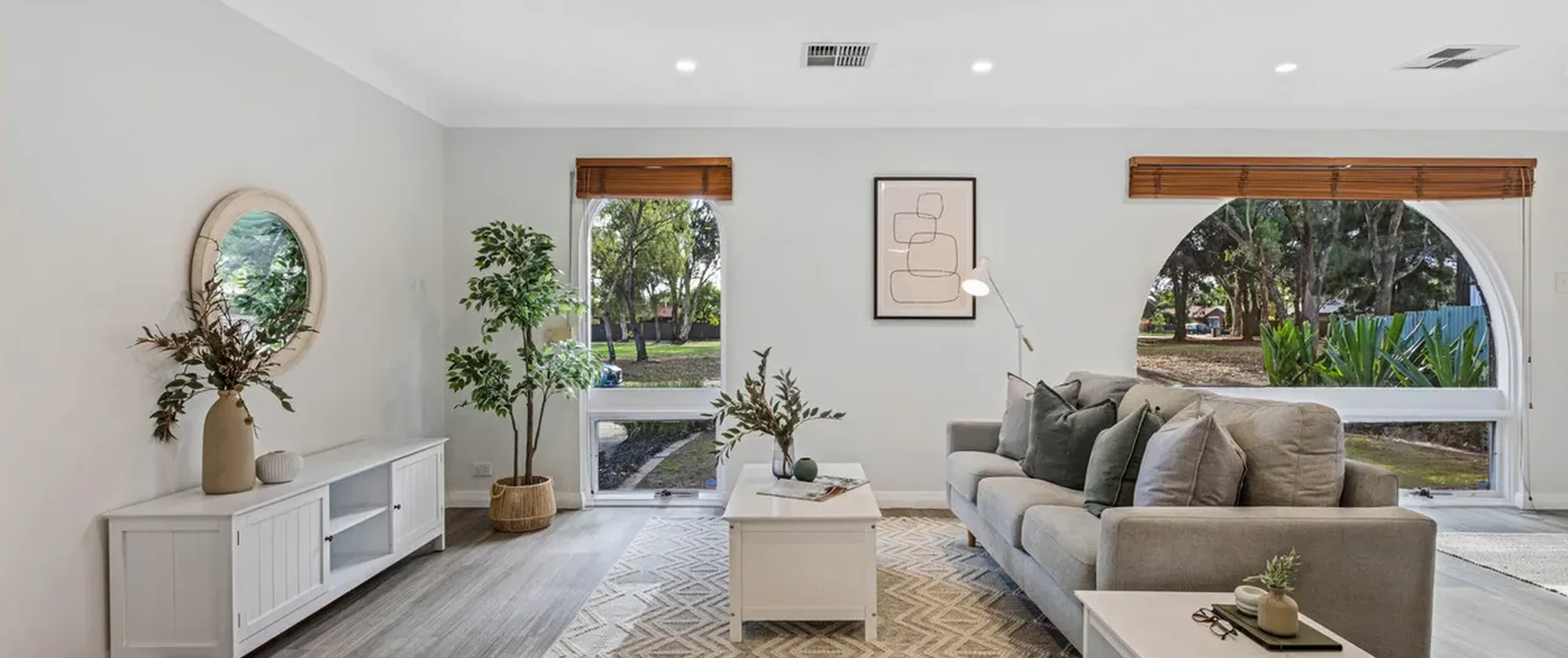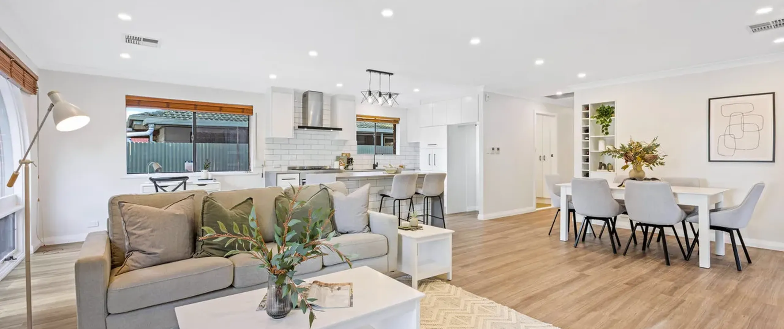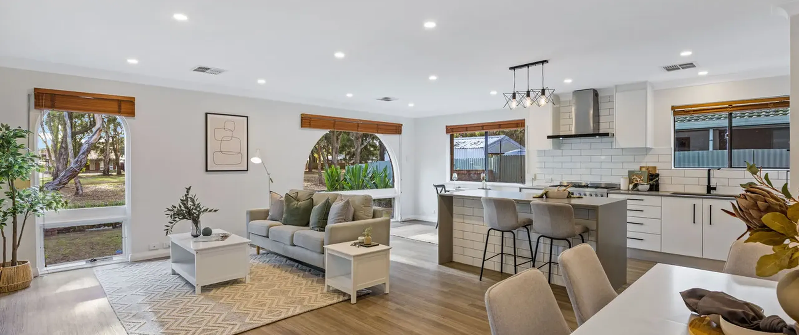 - Open and free flowing kitchen, dining and living with natural light coming from the feature arched windows