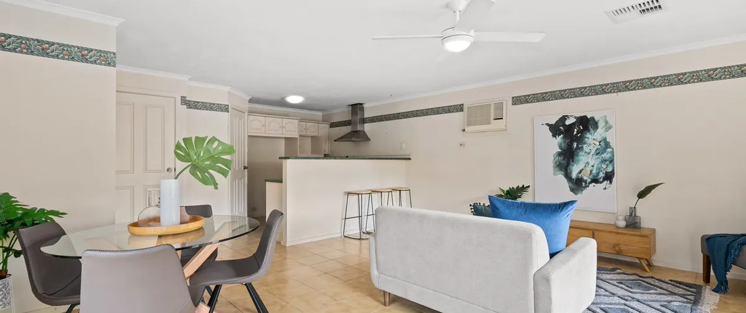 - Open plan living, dining and kitchen with ceiling fan and wall unit air conditioner