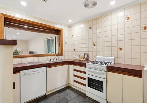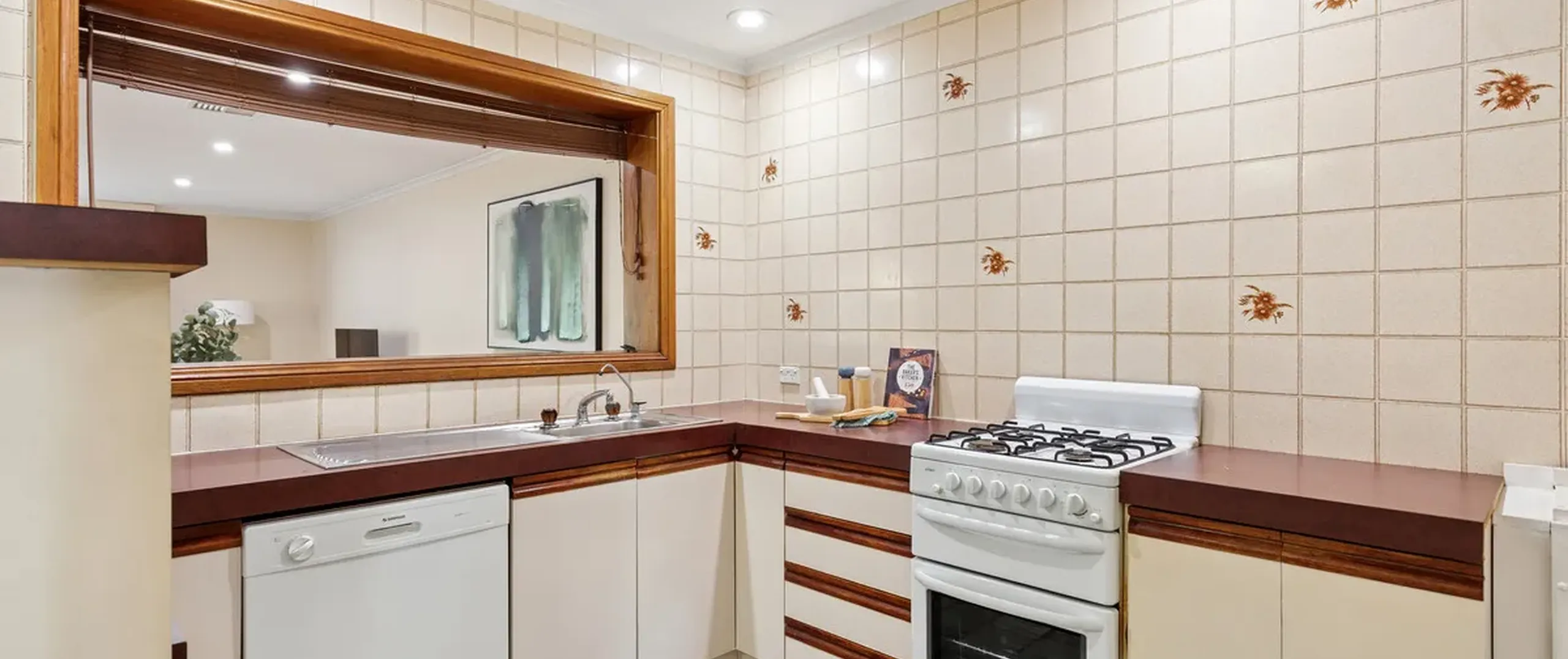 - Kitchen with gas cooktop and oven, dishwasher, servery and ample cupboard space