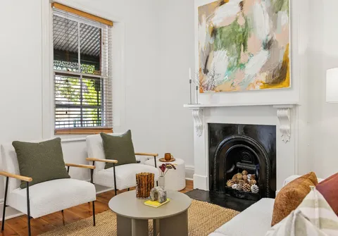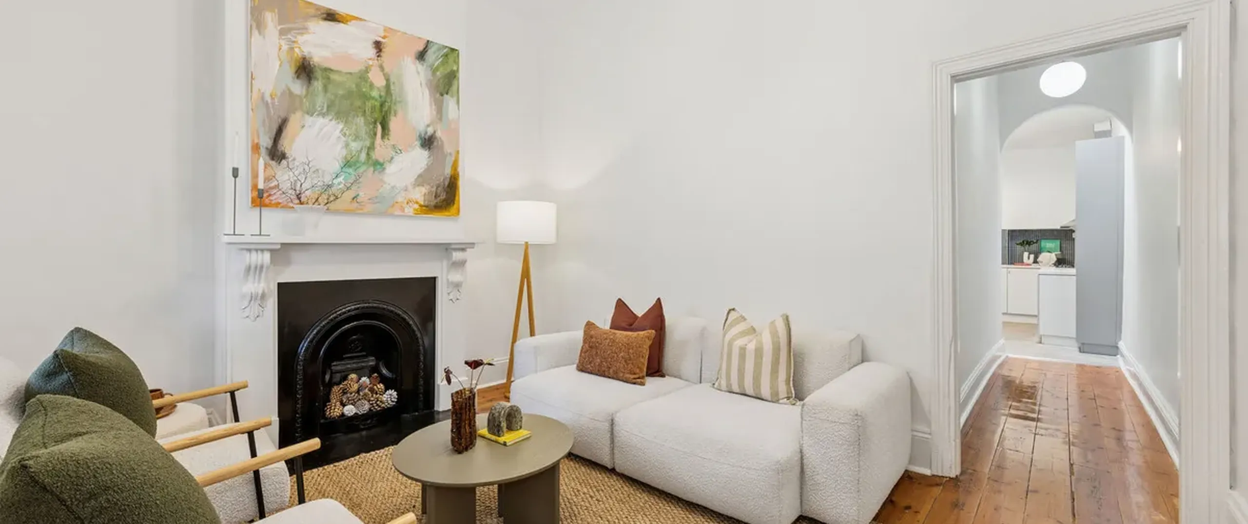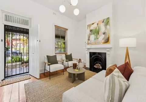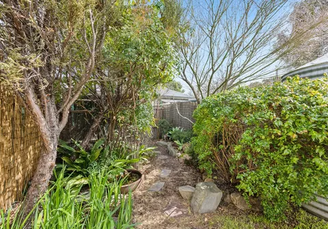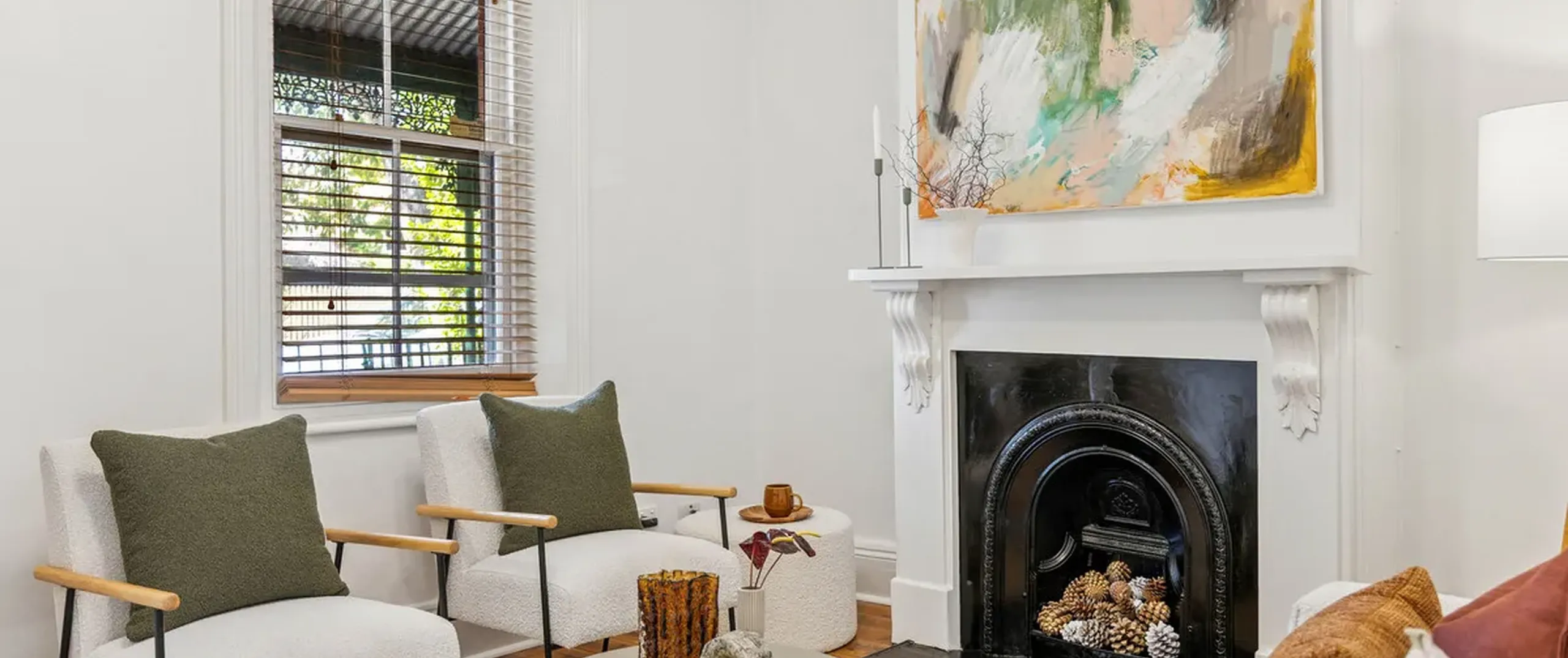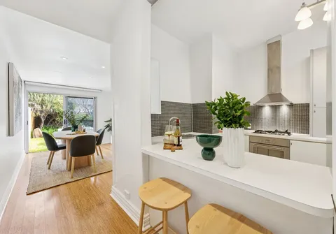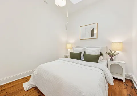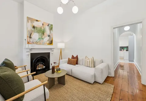 Behind its striking bluestone facade, lofty ceilings and polished Baltic pine floors set a tone of understated luxury. Sunlit interiors flow with ease, where heritage accents have been elevated by thoughtful design.