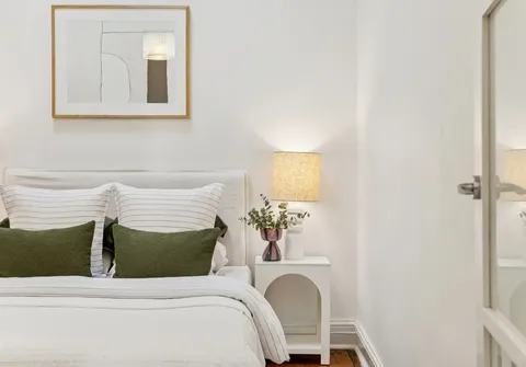 The large bedroom offers a tranquil retreat, also basking in natural light from its skylight. The large bathroom blends old-world charm with sleek finishes, featuring a freestanding bath, updated vanity and chrome tapware.