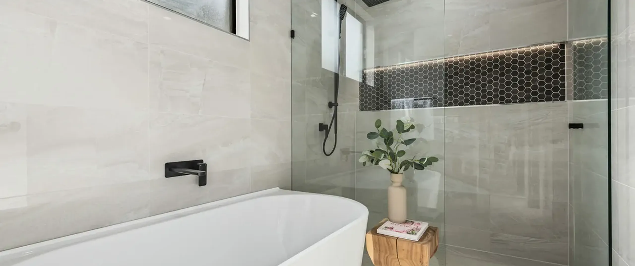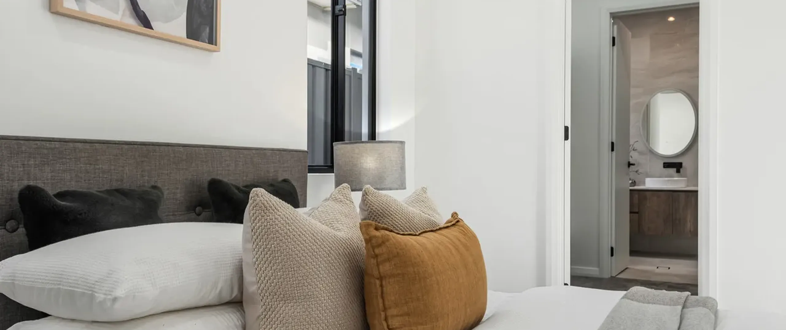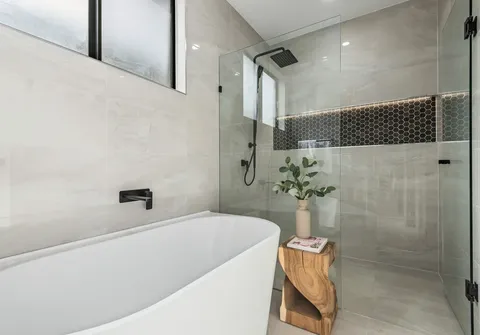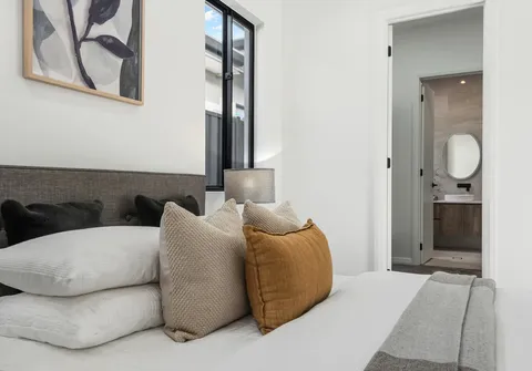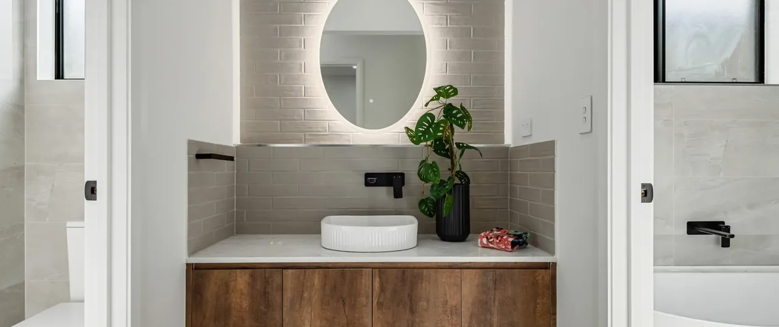 - Large master bedroom with walk-in robe and immaculate ensuite featuring stone-top vanity with dual basins and two stylish round mirrors overhead, matte black tapware, large shower niche and floor to ceiling tiling