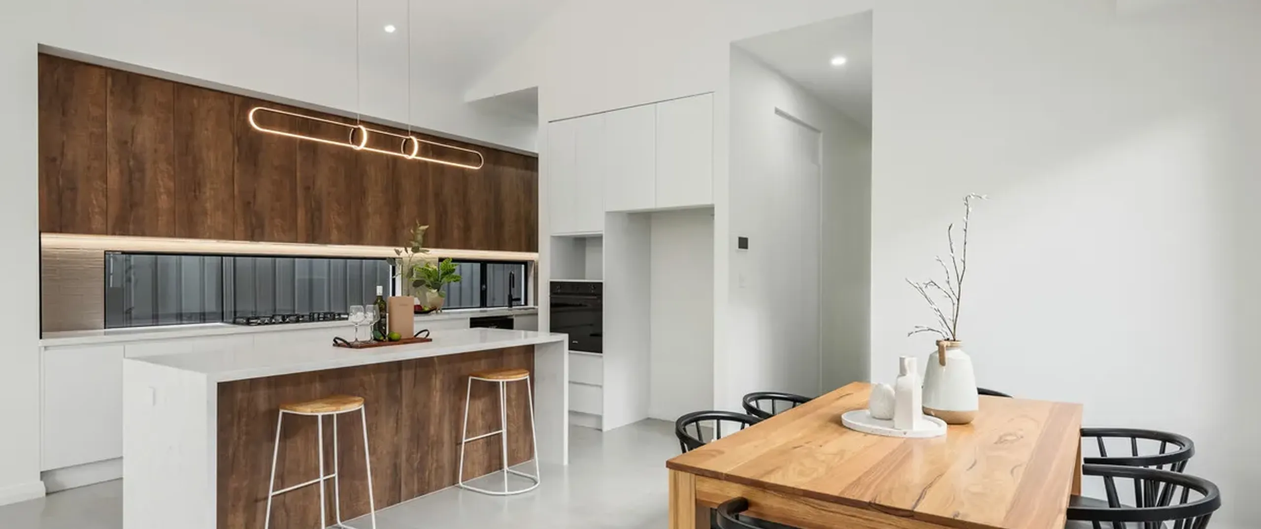 - Contemporary kitchen with large island breakfast bar, elegant stone benchtops, window splashback, white and wooden finished cabinetry, large walk-in pantry, matte black tapware and high-quality appliances including a 5 burner gas cooktop, oven and dishwasher