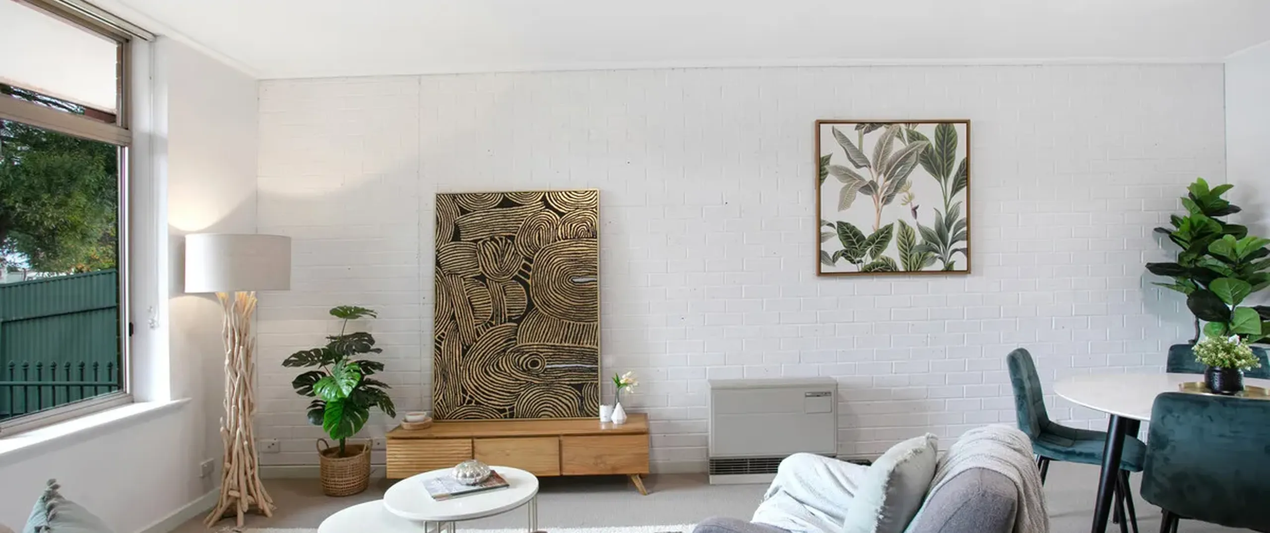 - Light-filled open-plan living and dining area with a gas heater