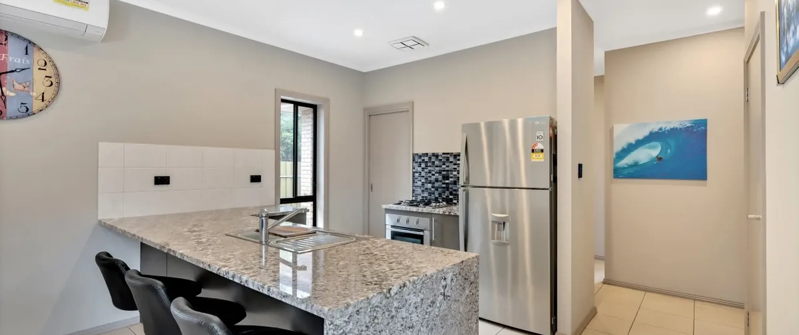 - Stunning modern kitchen with 30mm Granite benchtops, breakfast bar, stainless steel appliances, gas cooktop, ample bench space, dishwasher and a good size butler’s pantry!