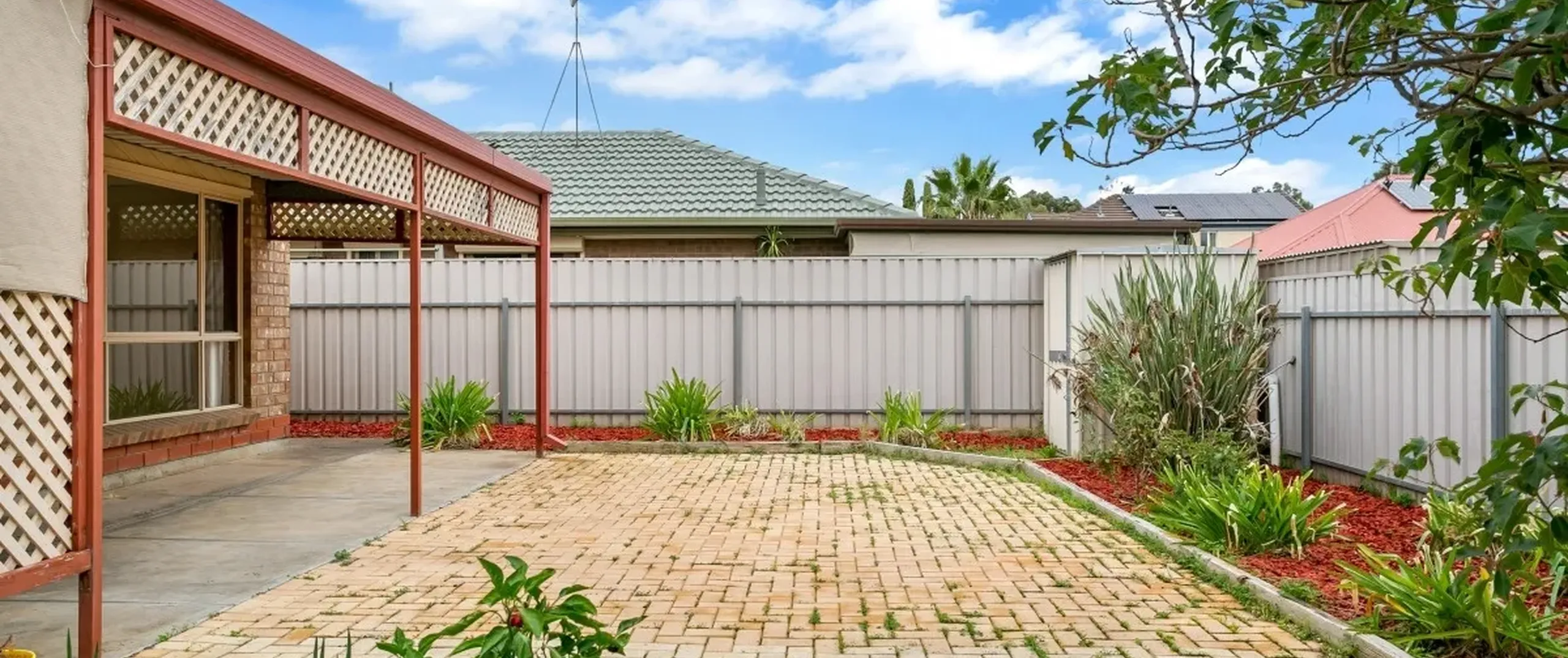 - Low maintenance paved courtyard with manicured gardens and garden shed