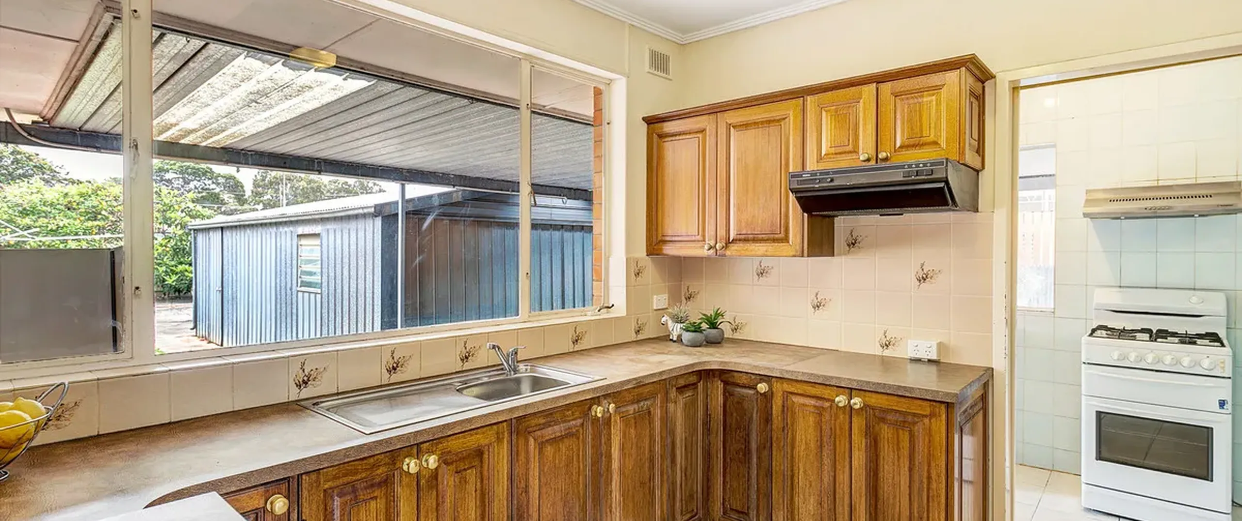 - Practical timber kitchen with ample cupboard and bench space and skylight