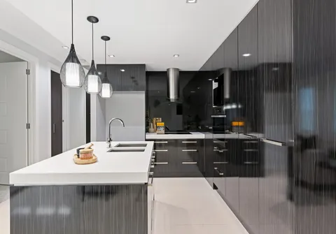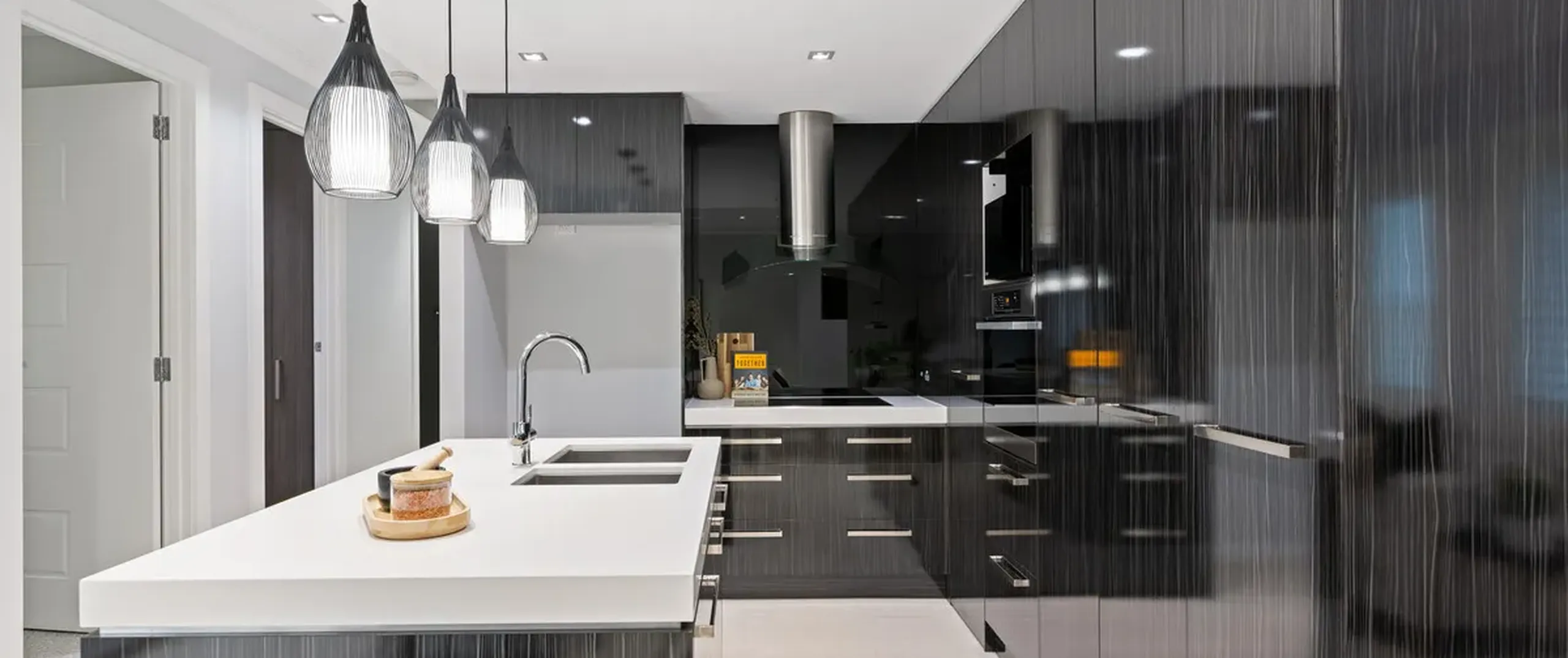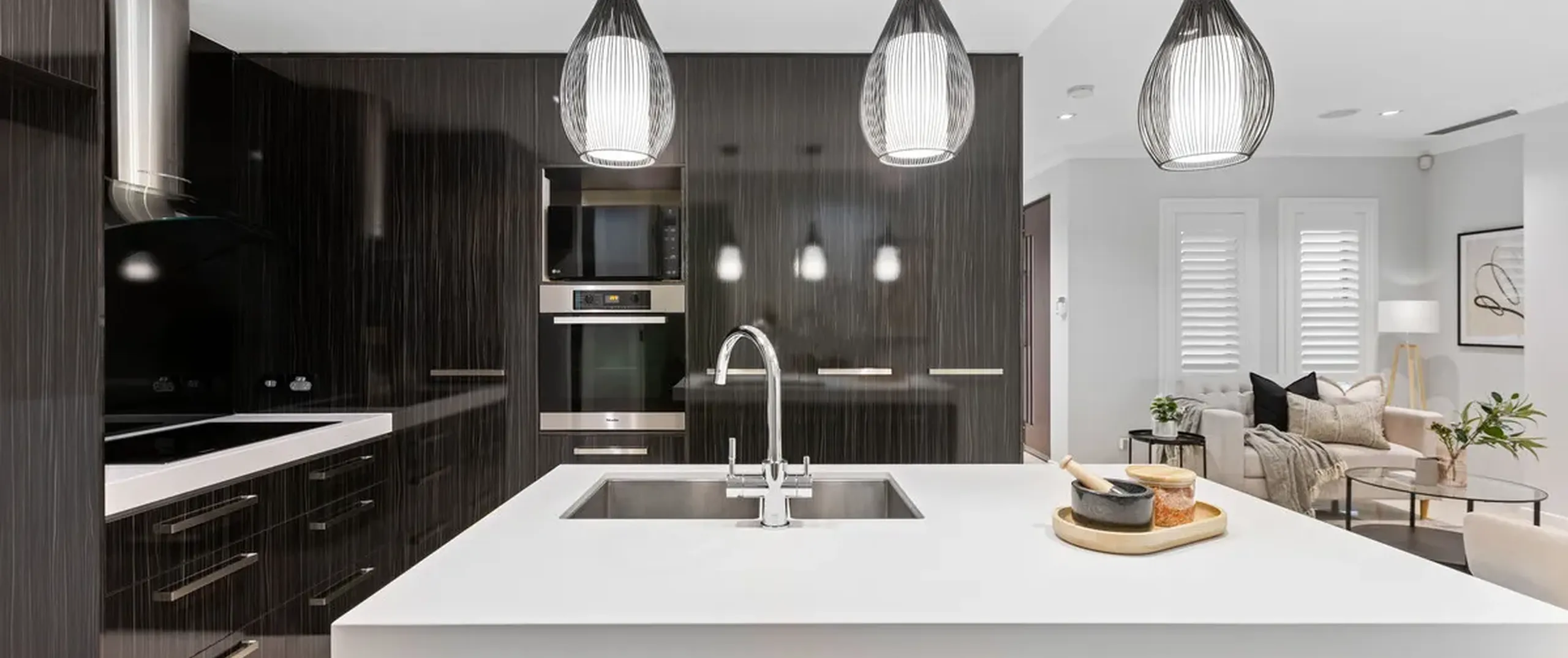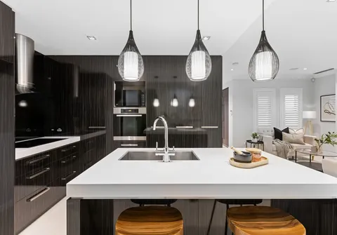 - Modern and moody kitchen with induction cooking, integrated dishwasher and oven, sweeping stone bench tops and breakfast bar with stylish pendant lighting
