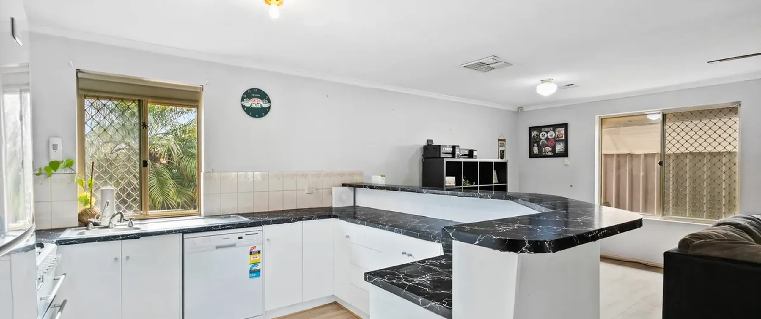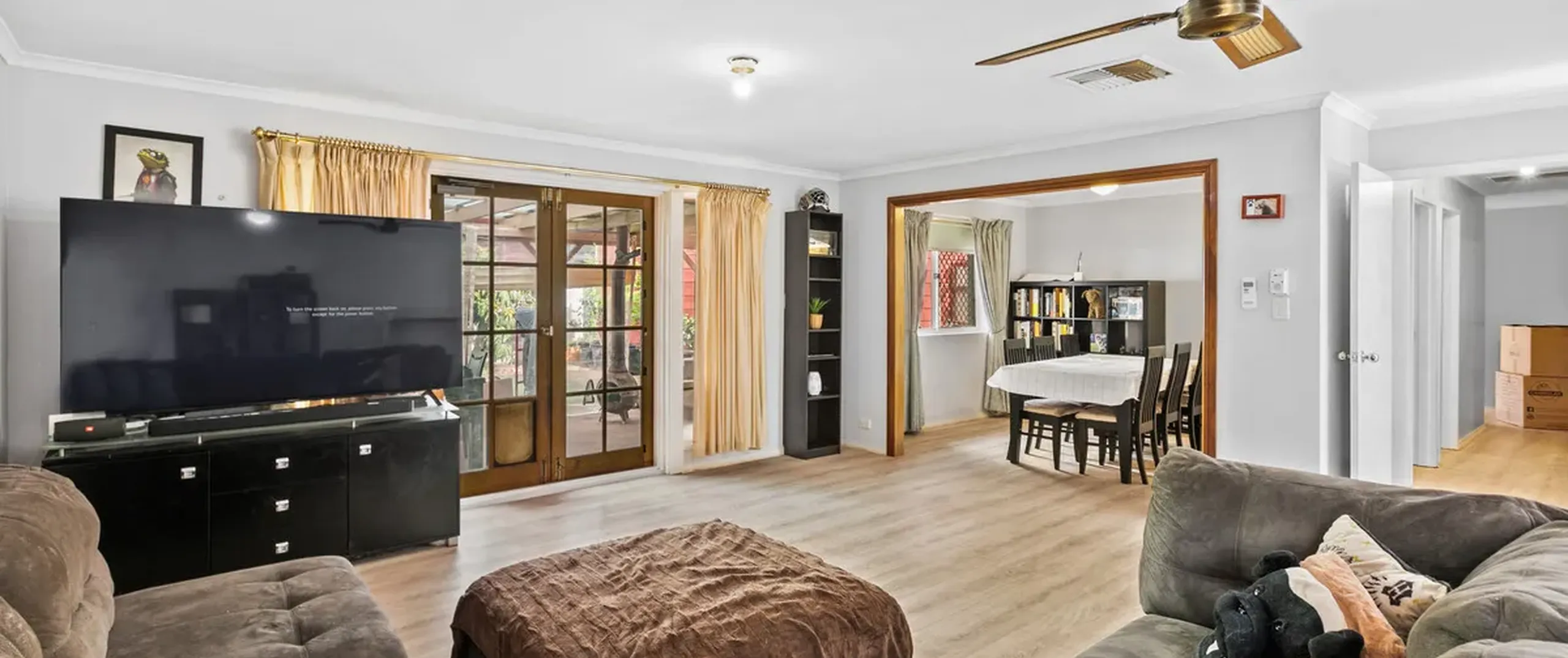 - Spacious open-plan kitchen, meals and living room with ceiling fan and French doors opening to the pergola