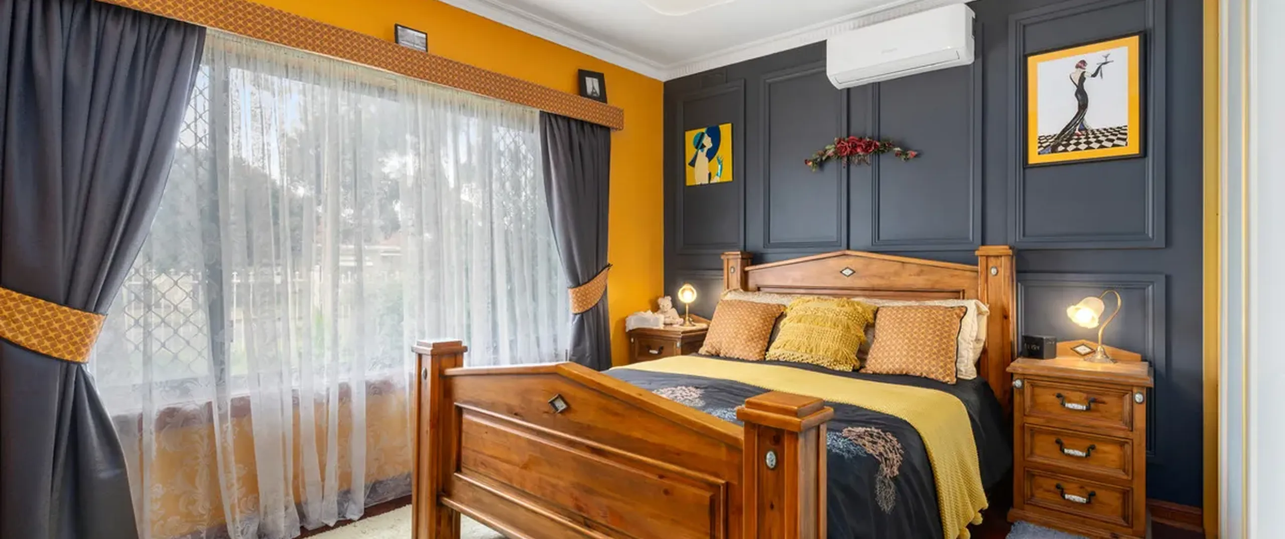 - Master bedroom with large built-in robe and split system air conditioner