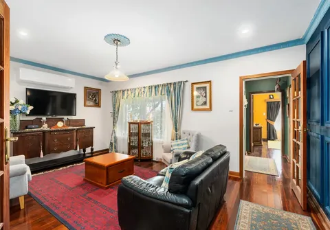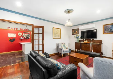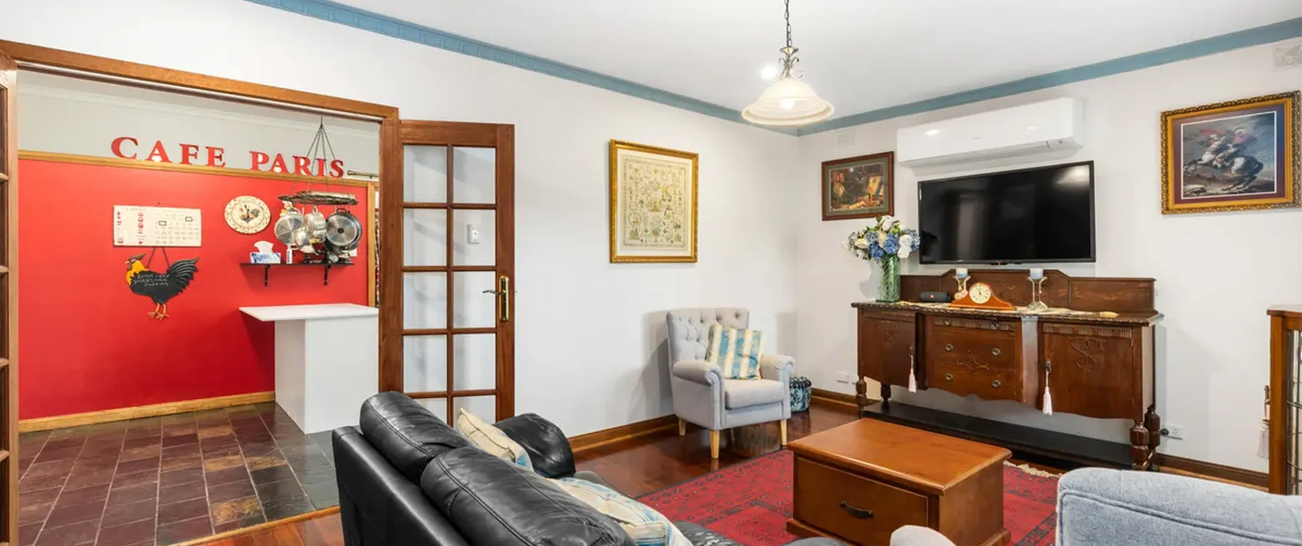 - Charming lounge room with ceiling rose, French doors and split system air-conditioner