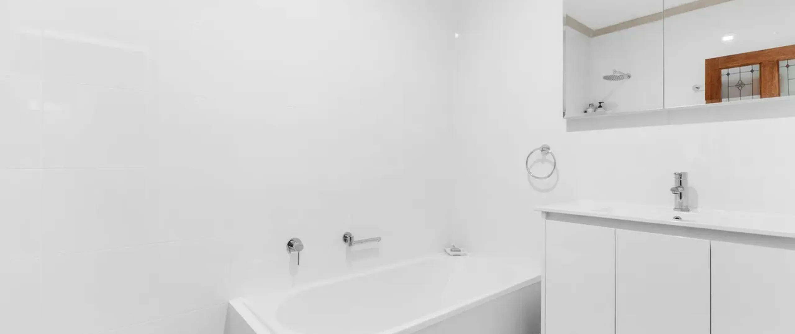 - Sparkling white bathroom with floor to ceiling tiles, separate bath and shower + separate toilet