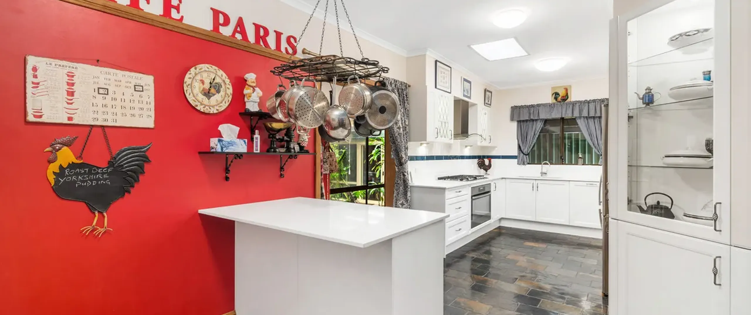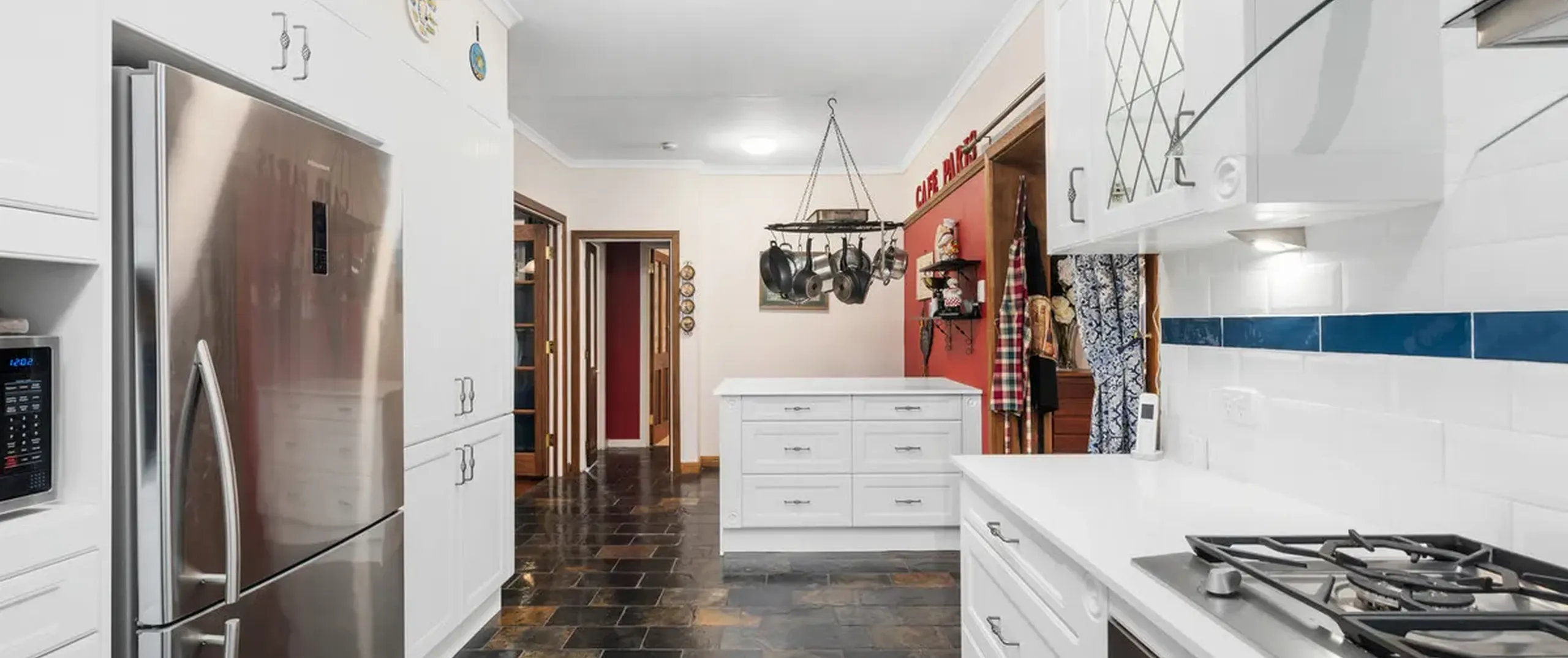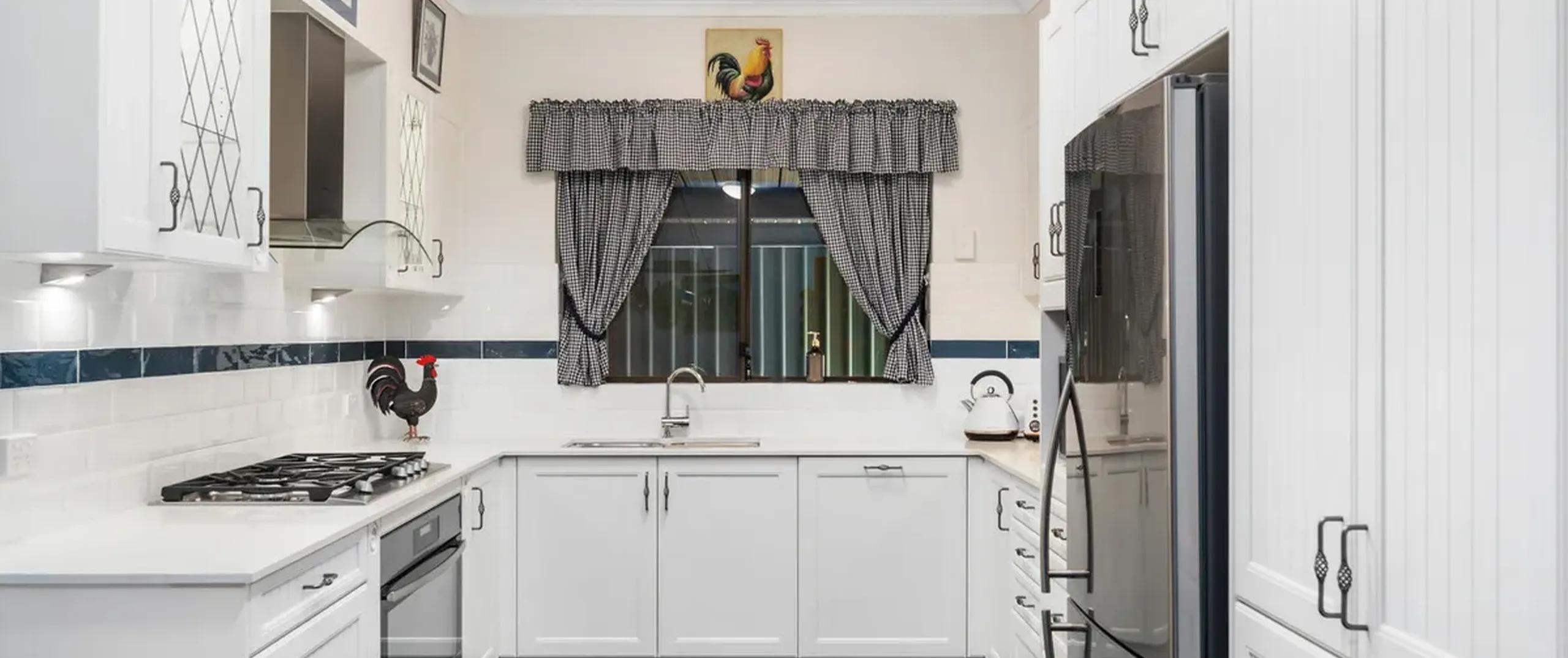 - Classic white kitchen complete with gas cooktop, pantry and ample cupboard and island bench with breakfast bar