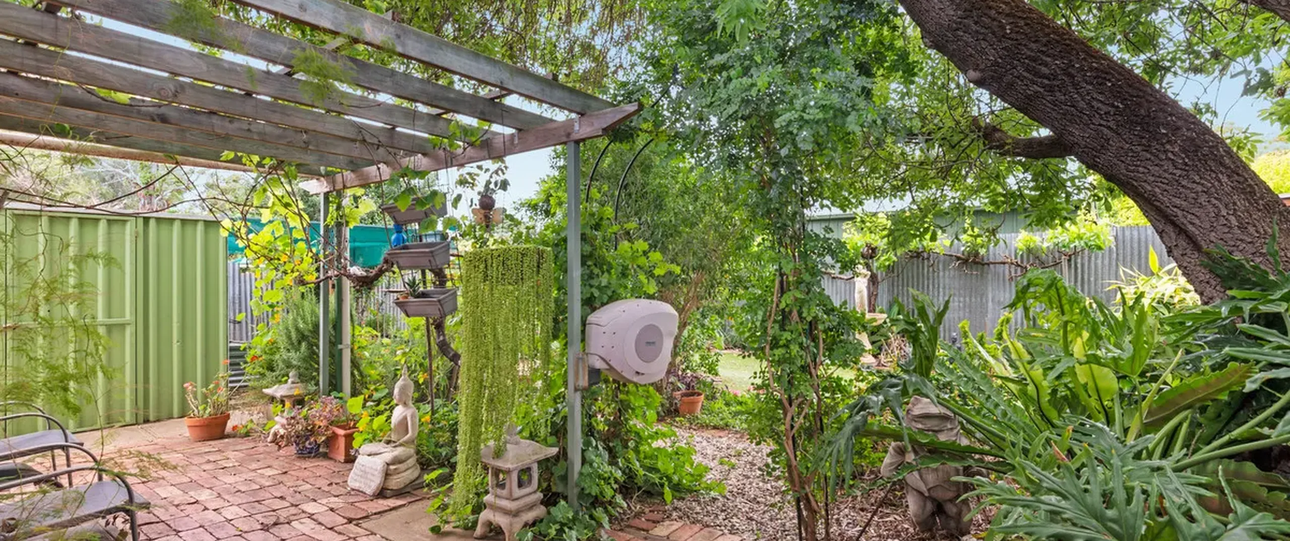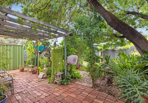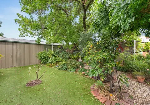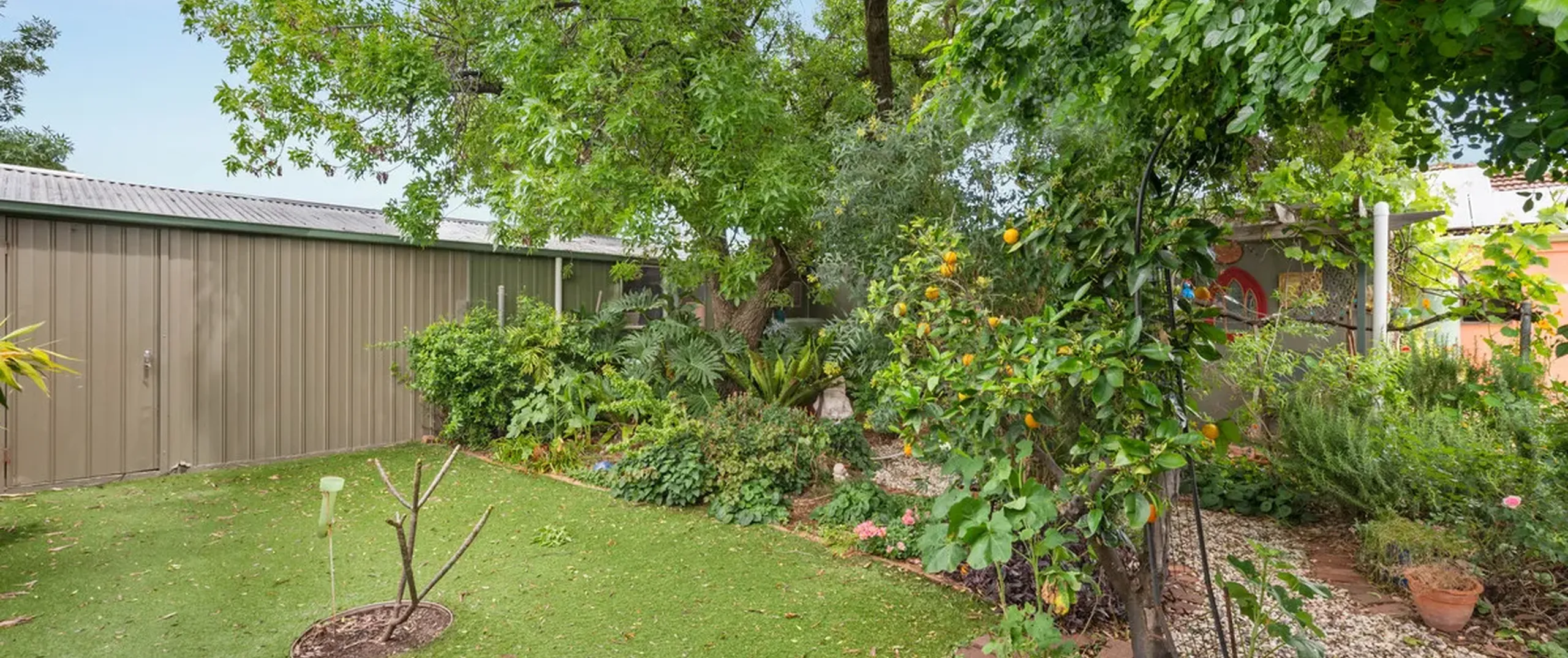- Large backyard with beautifully established gardens complete with various fruit trees