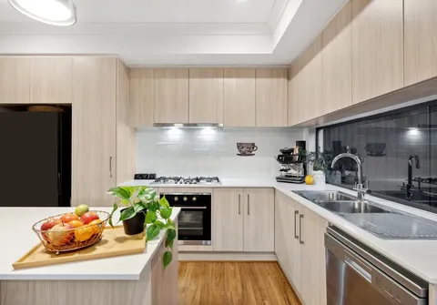 - Modern kitchen with sleek cabinetry, stone benchtops, island bench with breakfast bar, gas cooktop, oven and stainless-steel dishwasher