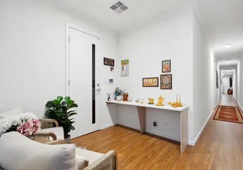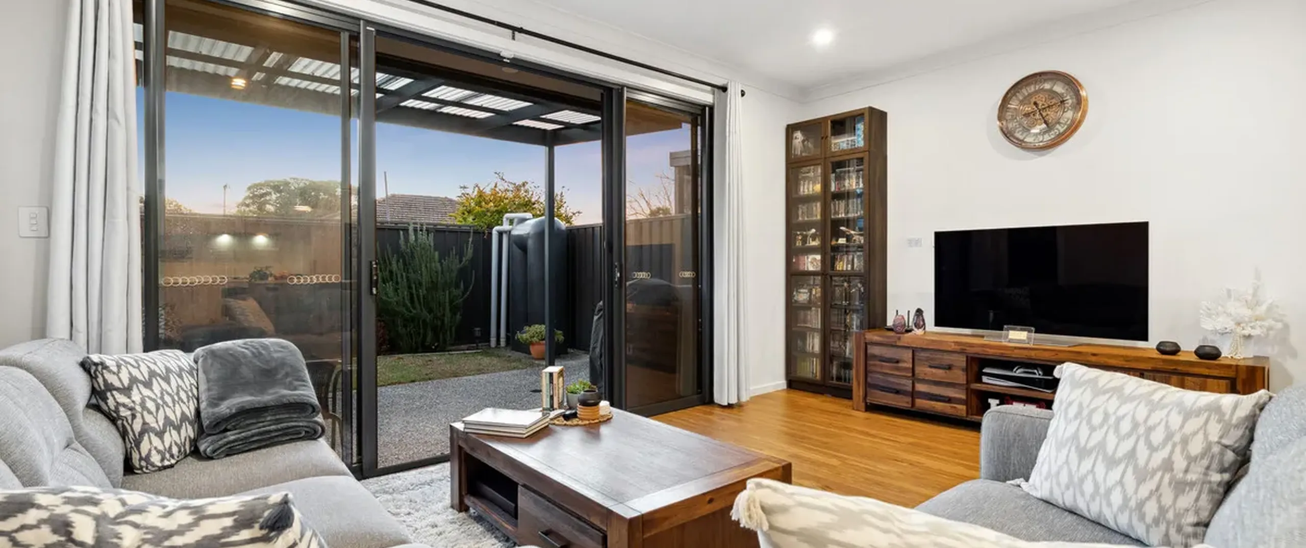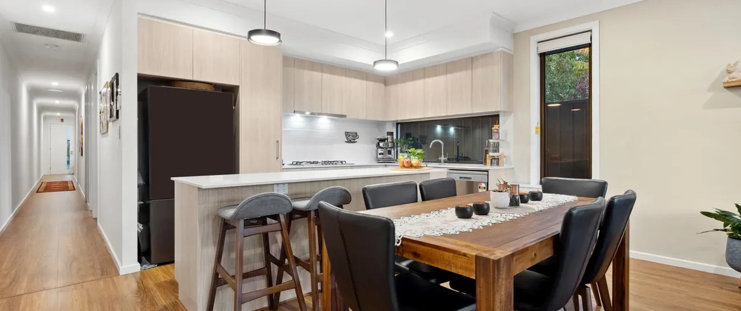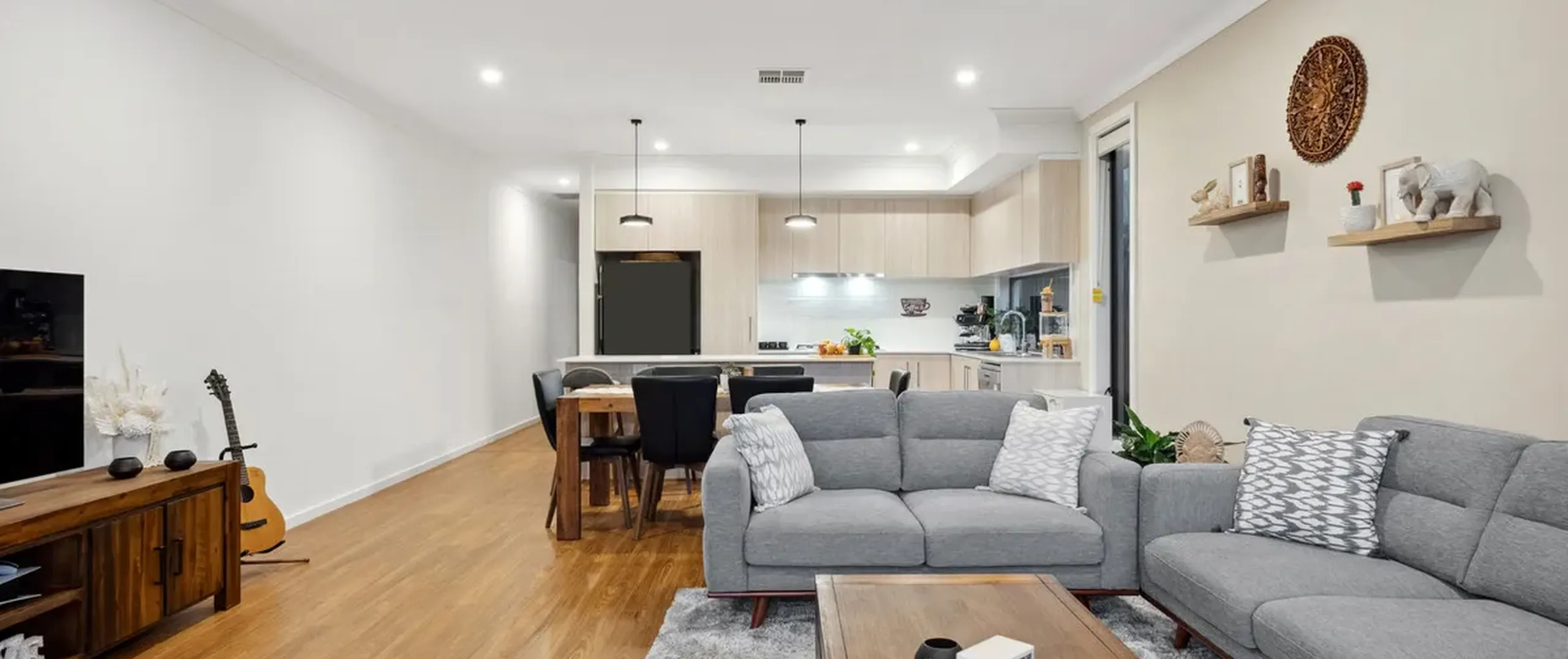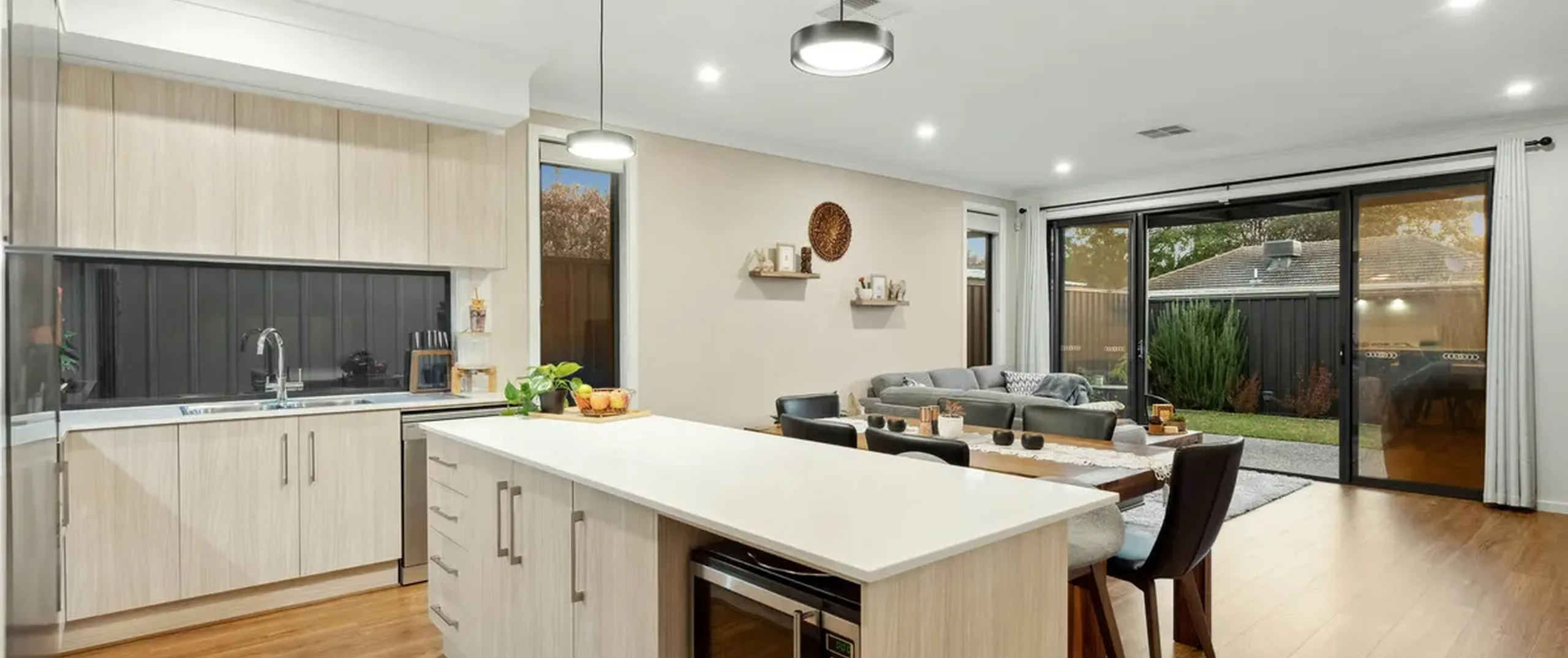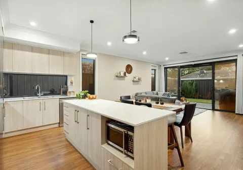 - Light-filled and modern open-plan living, dining and kitchen with LED downlights, warm timber-look flooring, stylish black framed windows and seamless indoor-outdoor flow to outdoor living