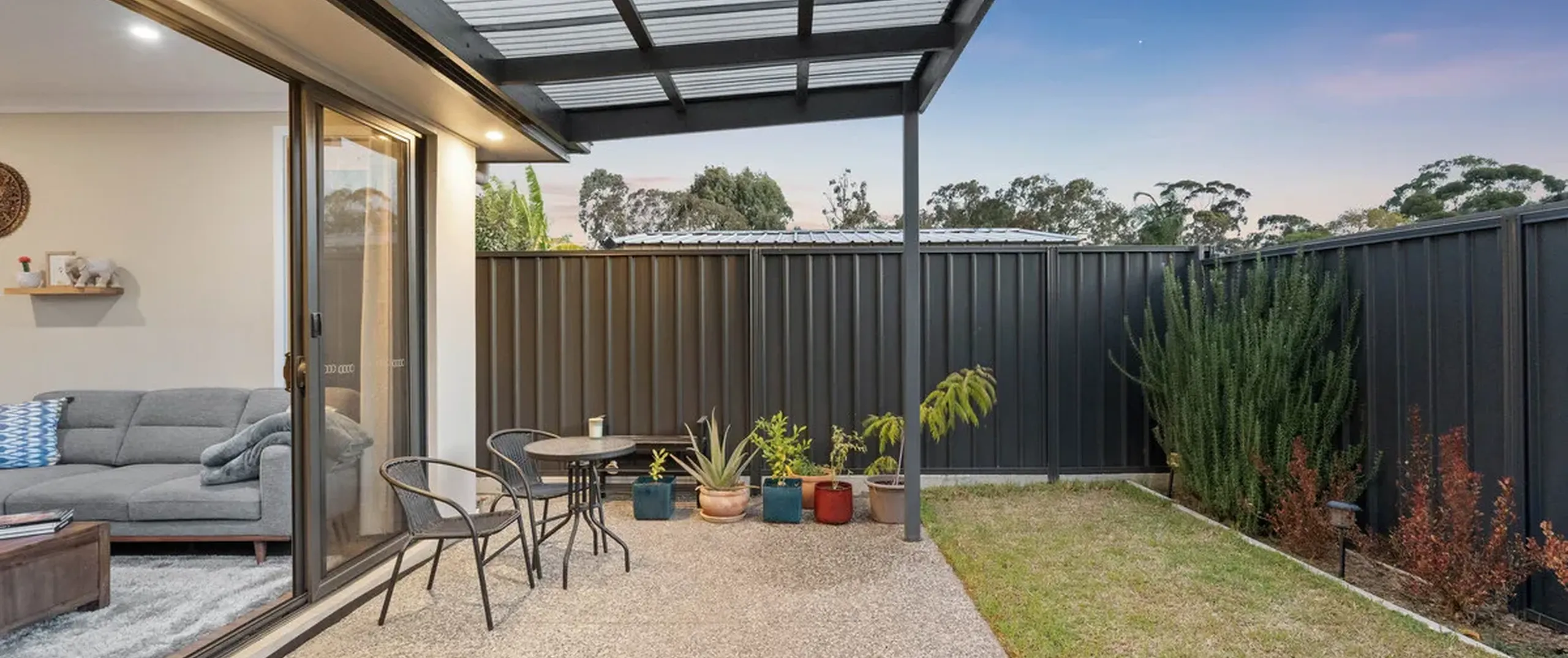 - Aggregate concreted outdoor living space with angled pergola overlooking low-maintenance lawn and easy-care garden bed