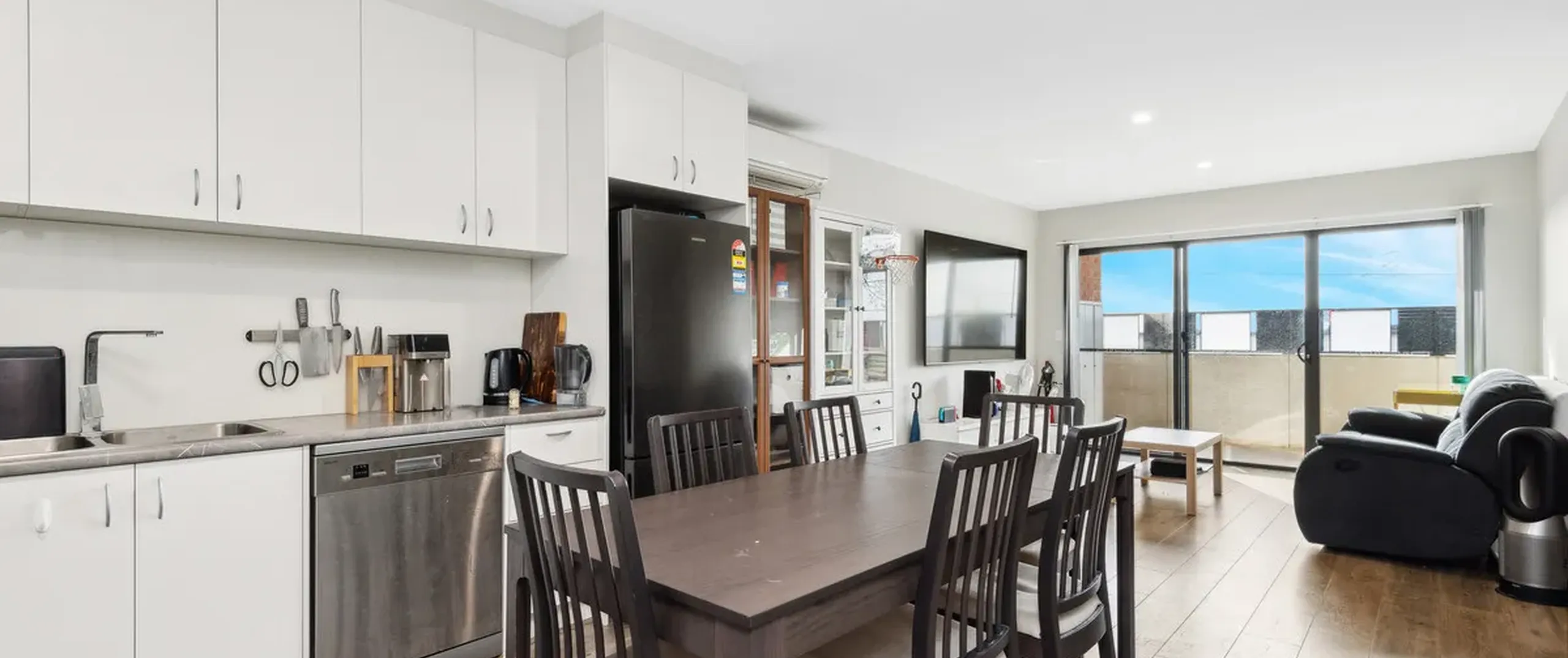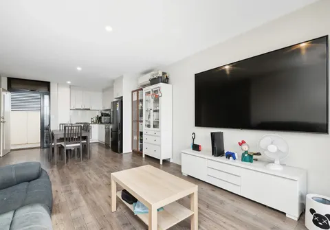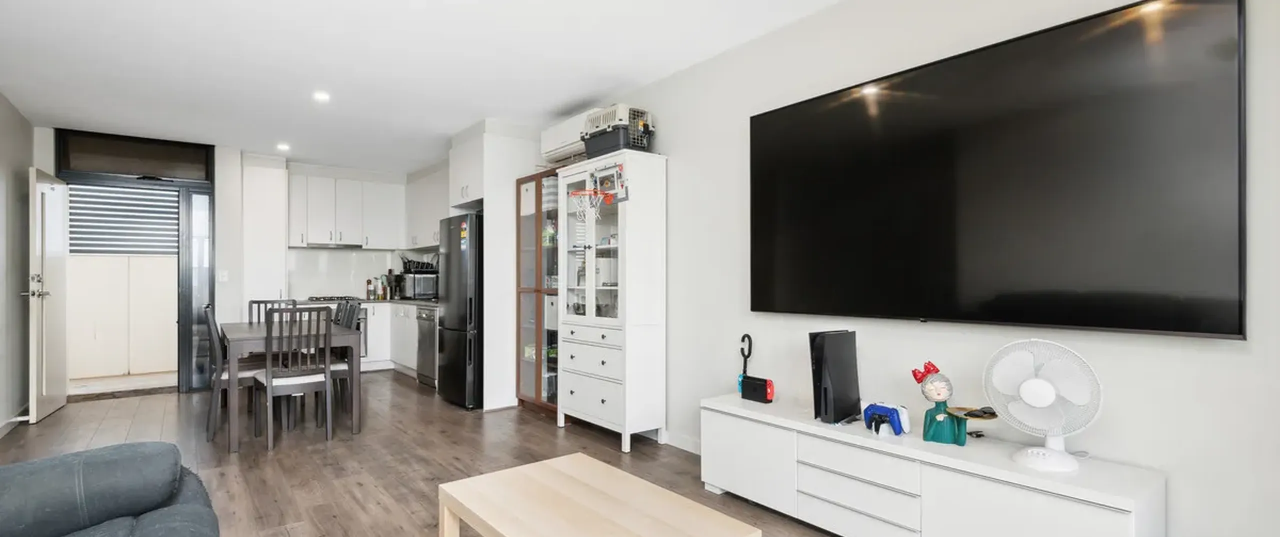 - Light filled open-plan living, kitchen and dining area with split system air conditioner