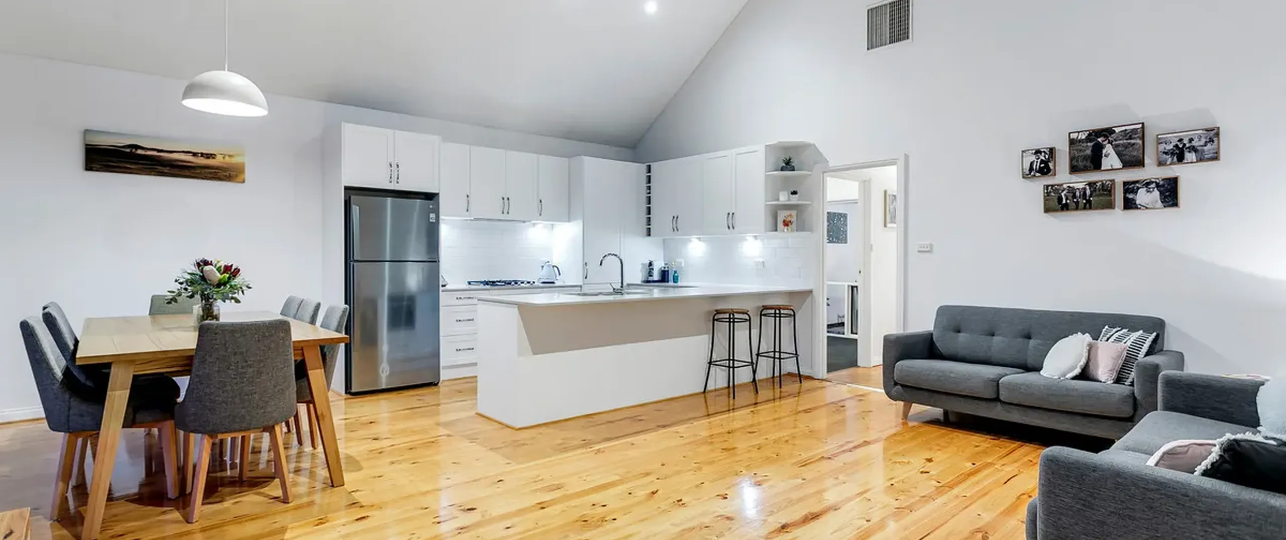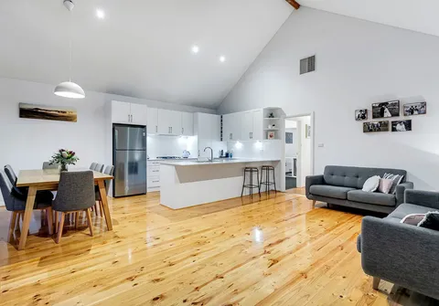 - Spectacular light filled open plan living/dining and kitchen area with reverse cycle split system air conditioner and pitched roof, perfect for entertaining with friends and family