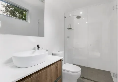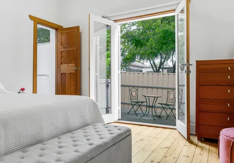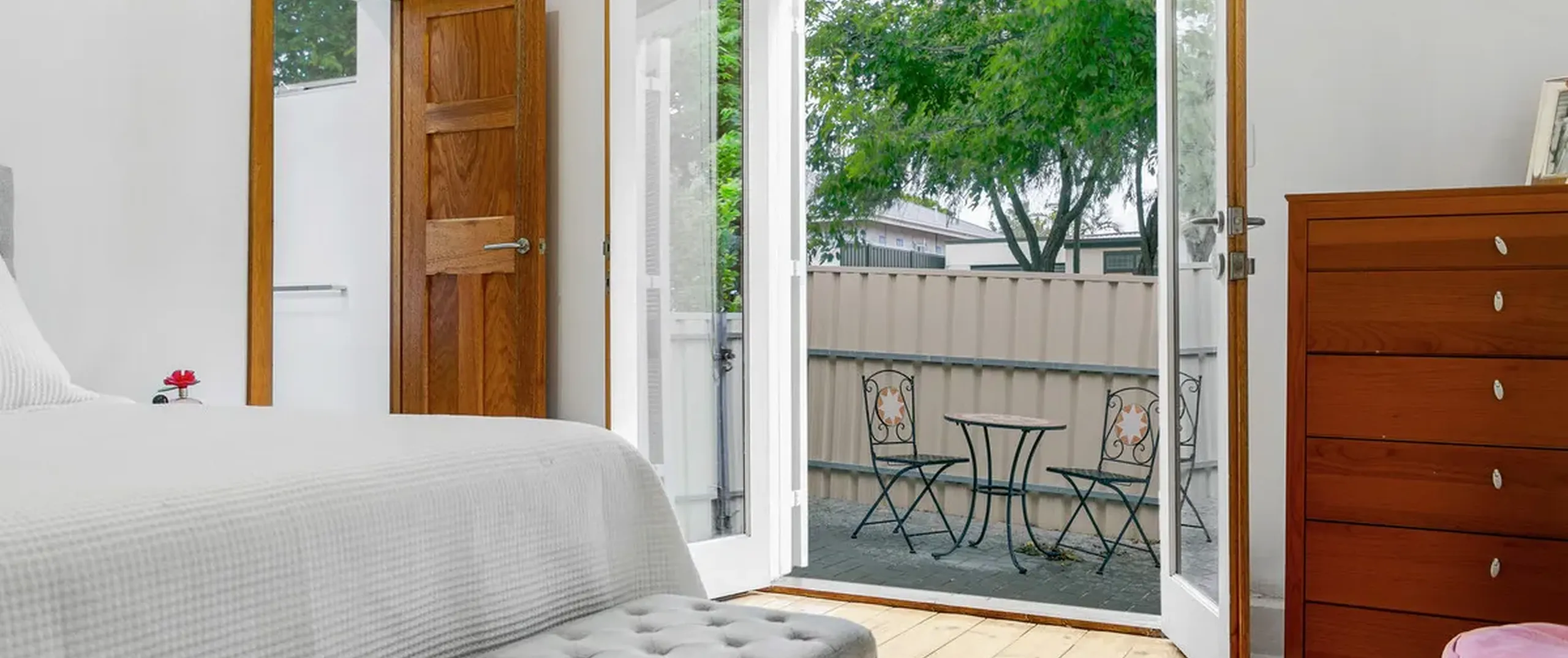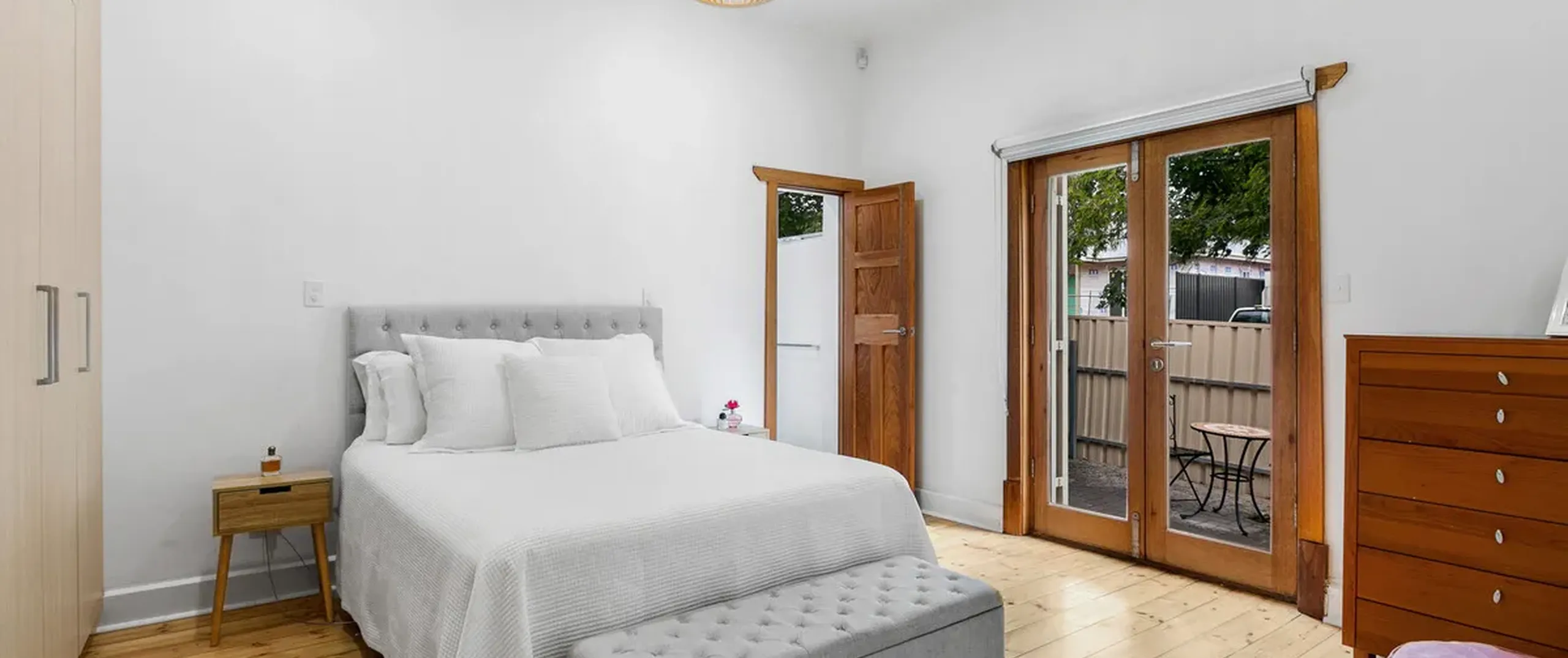 - Spacious bedroom 1 with Farquhar custom floor to ceiling built in robes, stylish ensuite and access to side courtyard through solid timber double doors