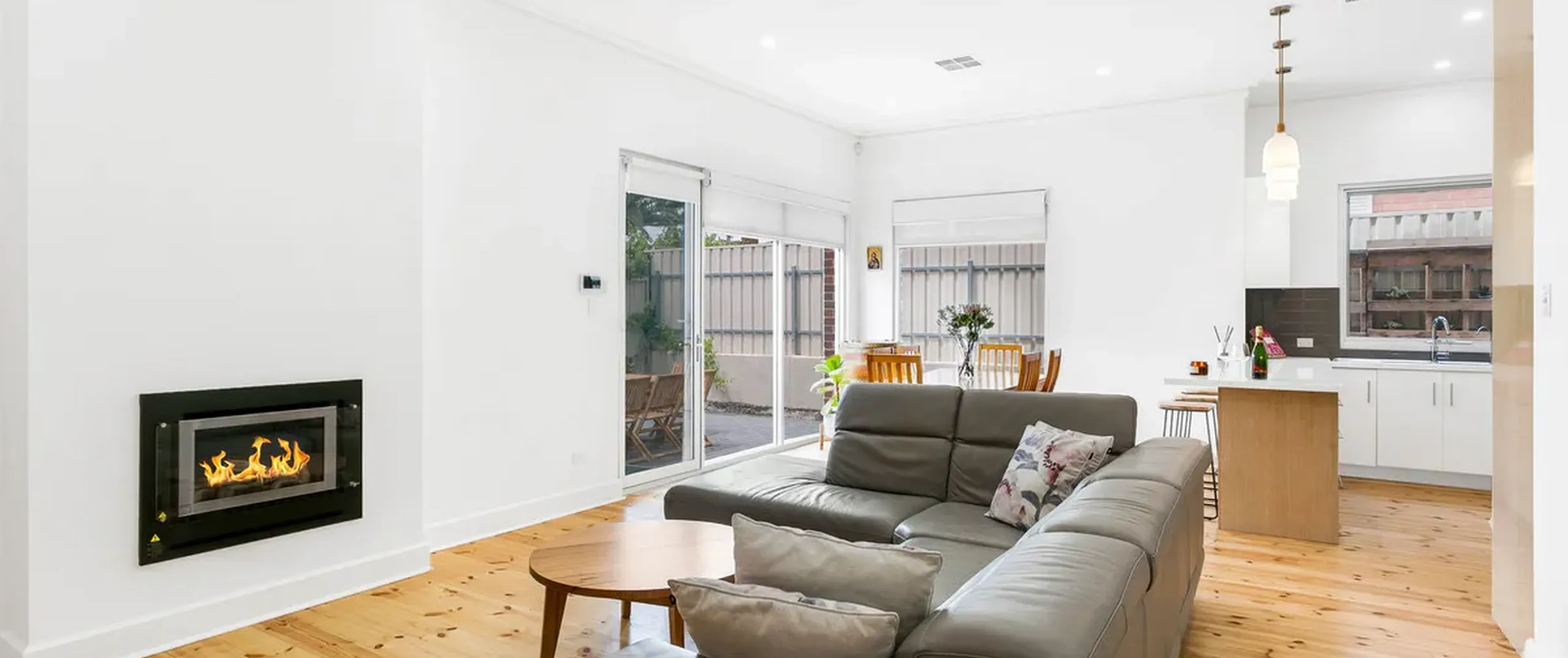 - Commodious open plan lounge and dining with gas heater, downlights throughout and overlooking the north facing courtyard with commercial grade high windows allowing an abundance of natural light