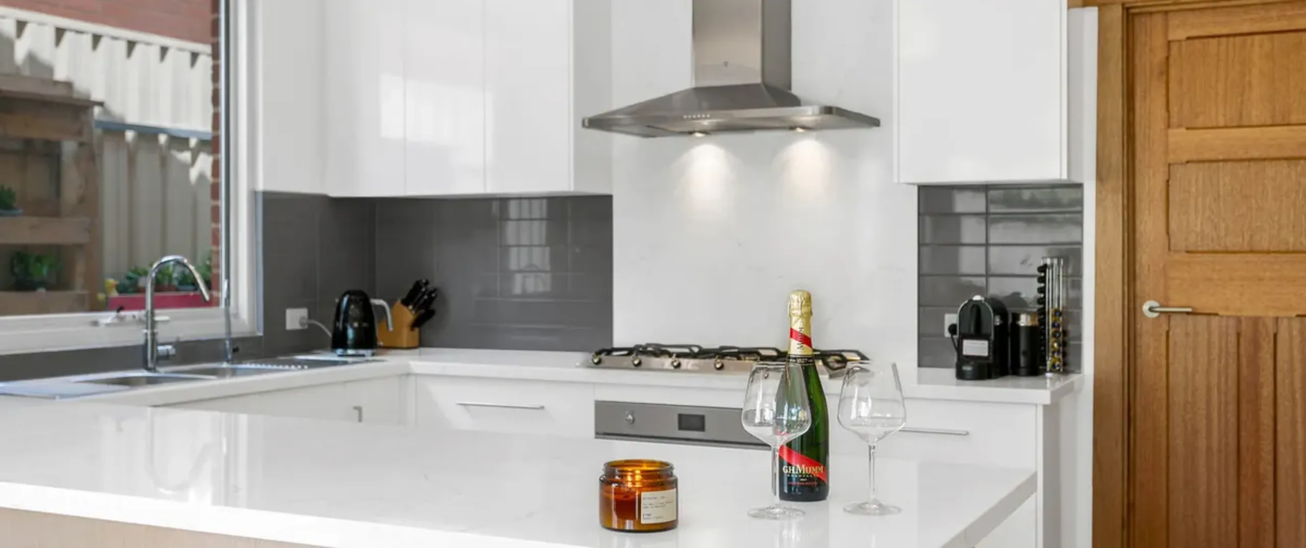 - Modern chefs’ kitchen with breakfast bar, quality Michelangelo Quarts benchtops, SMEG stainless steel appliances and ample cupboard space with soft close drawers