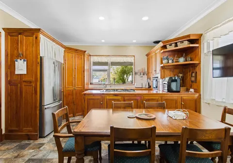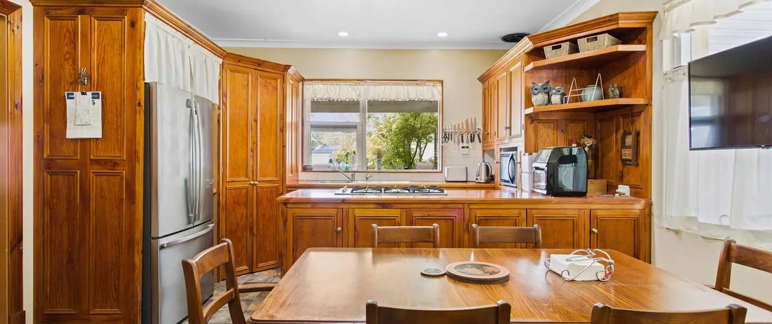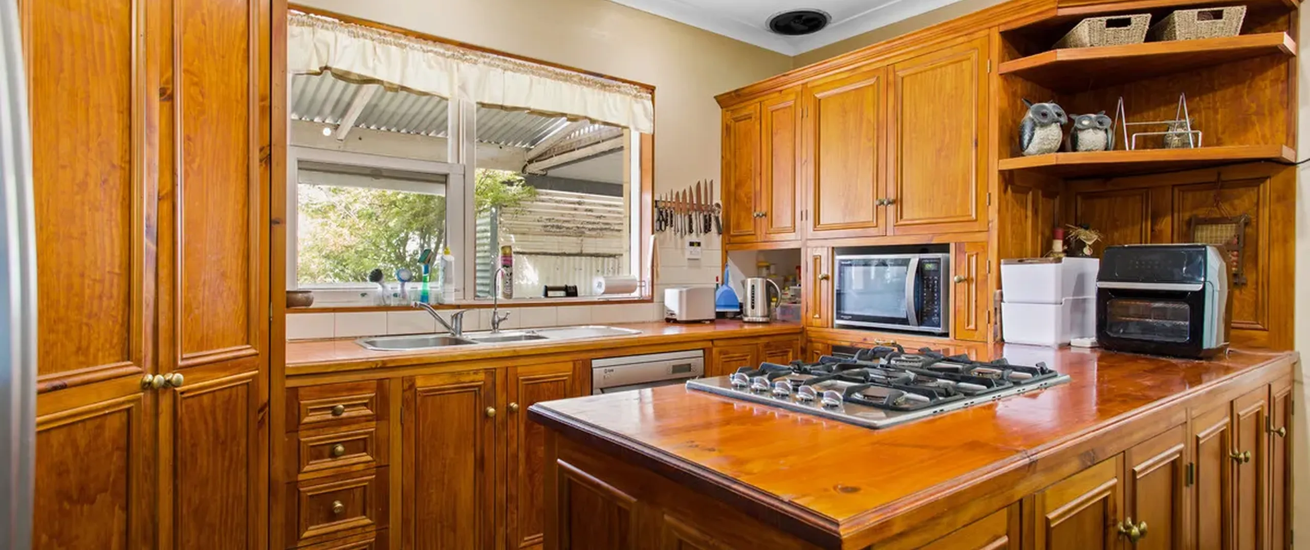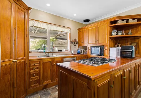 - Timber kitchen featuring ample cupboard and bench space, plus stainless steel appliances including a gas cooktop and dishwasher