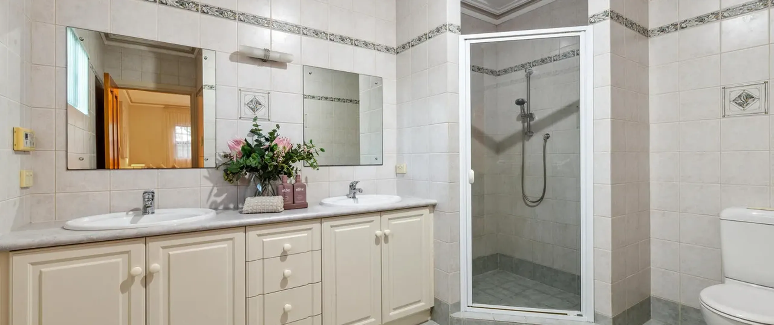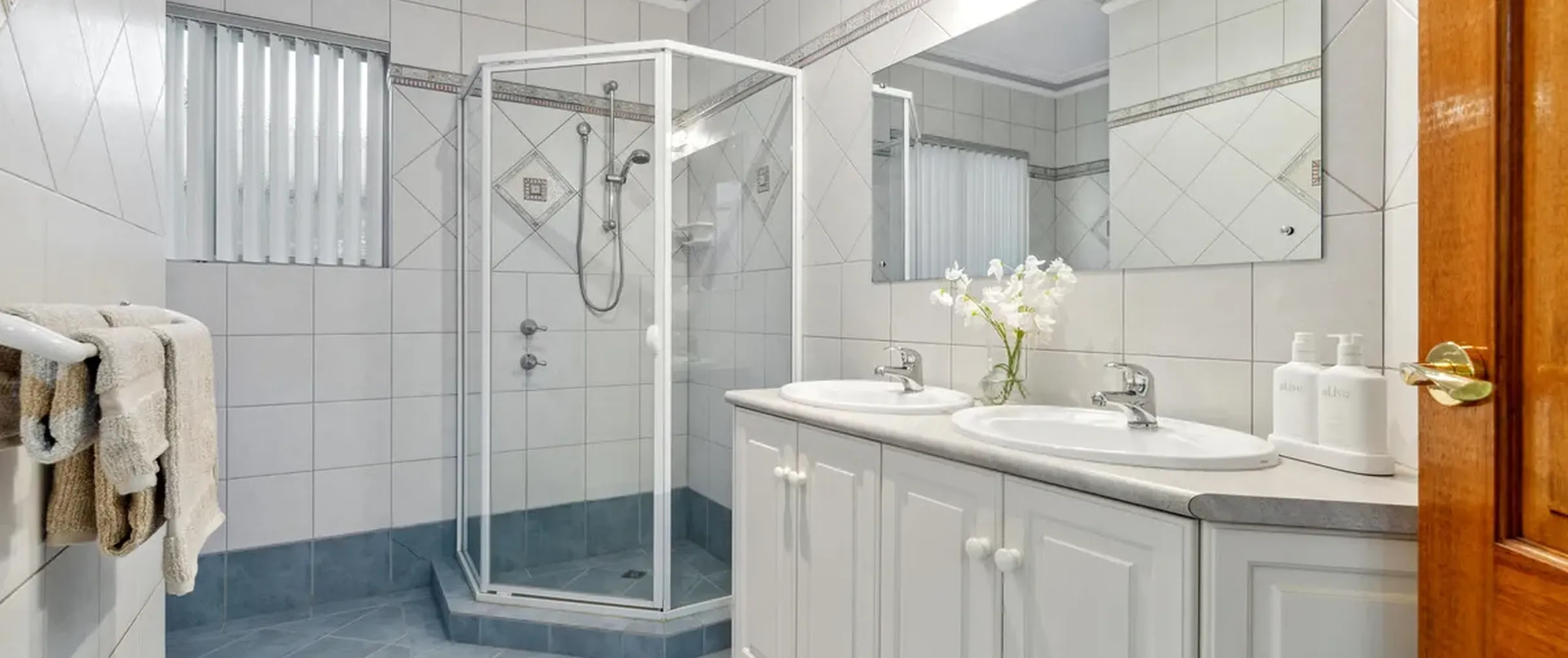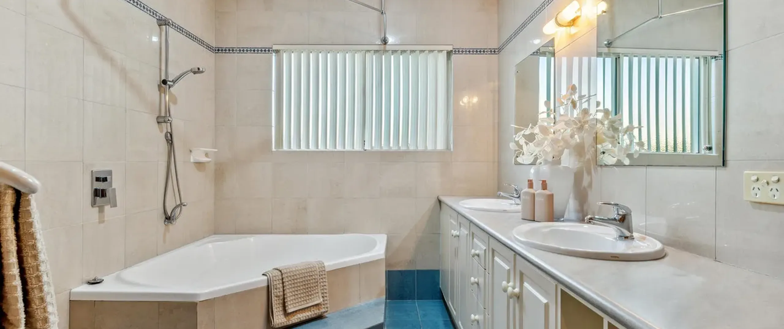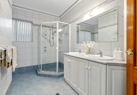 - Main bathroom with shower and dual basins
