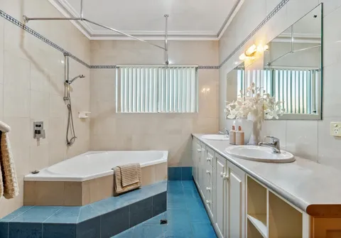 - Generous main bathroom with corner bath with shower head and dual basins