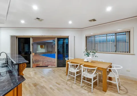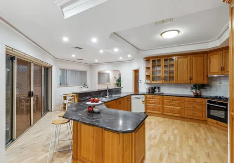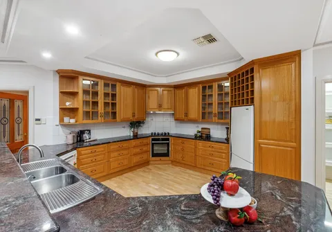 As you approach, a sophisticated facade and topiary hedging pave the way to a grand formal entrance, setting the stage for the expansive layout that unfolds before you. The gracious ambiance is highlighted by a truly impressive open-plan kitchen and meals area, formal lounge, and dining room illuminated with LED downlights and high-coffered ceilings. The timeless kitchen exudes charming character, boasting granite benchtops and ample storage to impress even the most discerning home chef. From the kitchen you can step out to the outdoor oasis. The masterpiece of this outdoor haven is the sparkling swimming pool and outdoor kitchen with a wood-oven, creating a picturesque setting for long and lazy lunches.