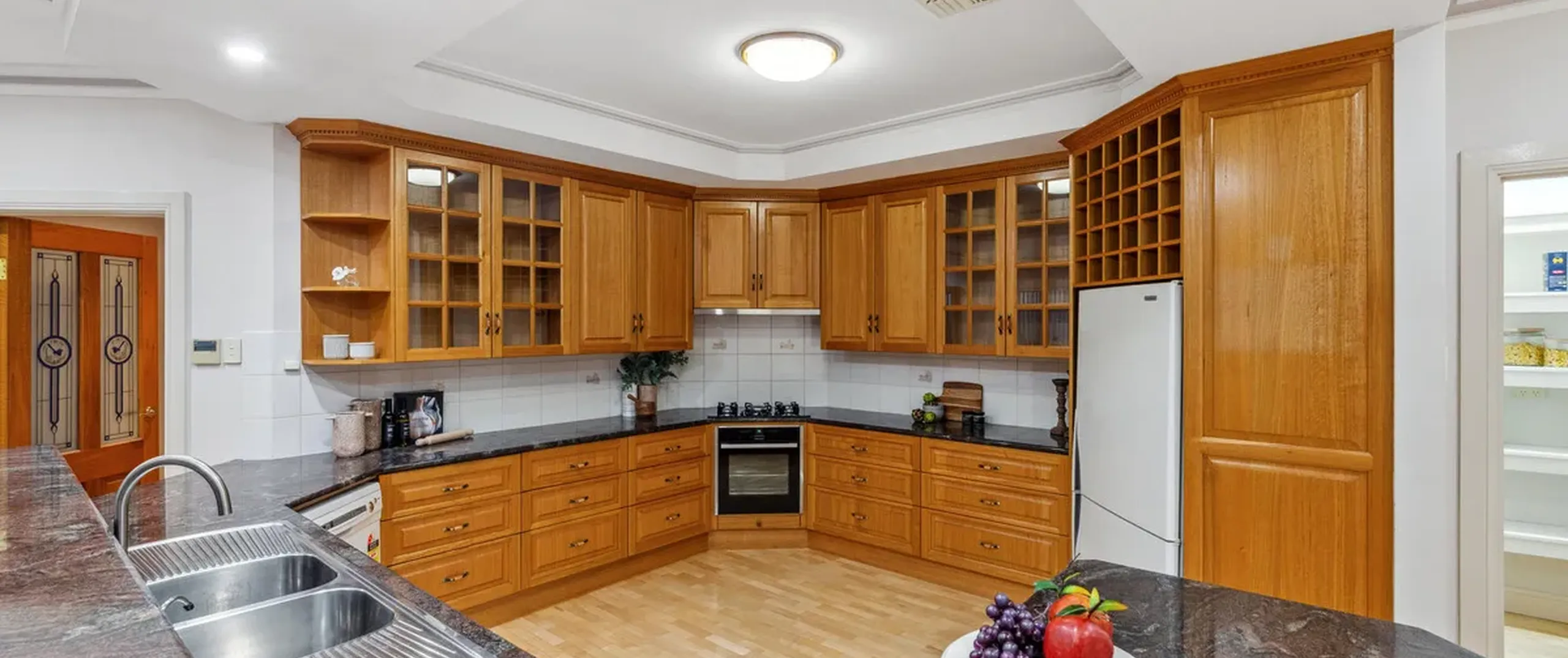 - Charming kitchen with an abundance of timber cupboards, walk-in pantry, dishwasher, gas cooktop, sweeping bench tops and breakfast bar