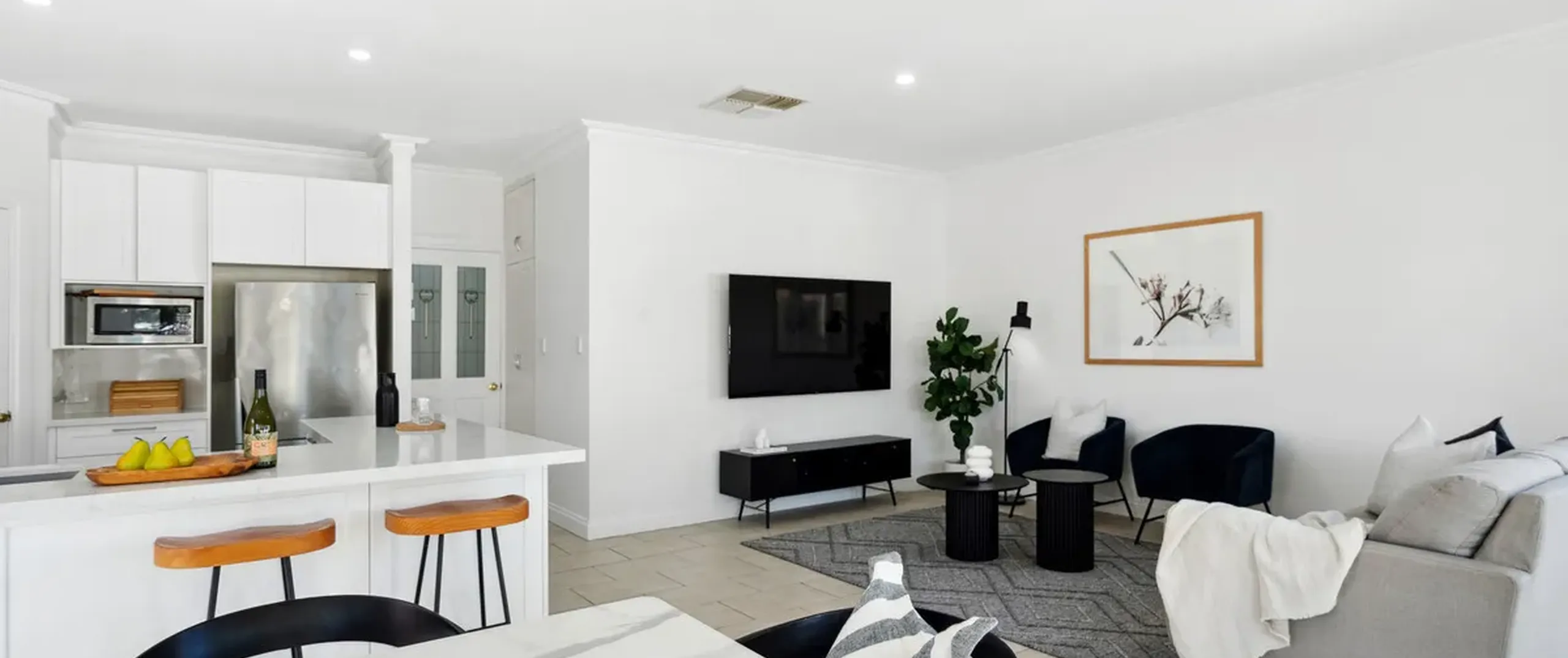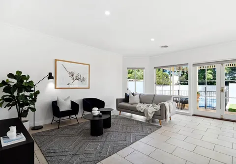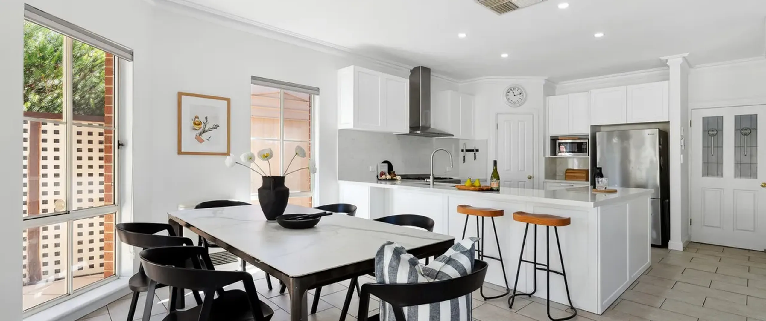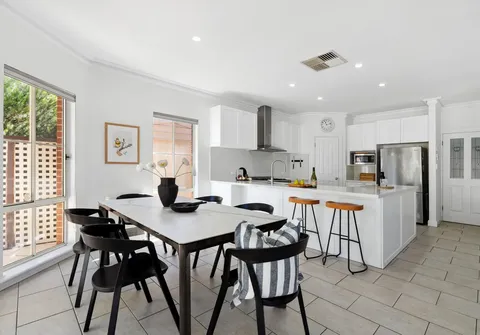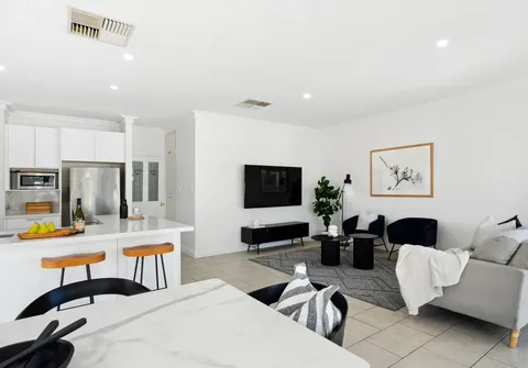 This Torrens title Circa 1999 reproduction villa captures the essence of classic architecture while seamlessly integrating modern amenities. As you enter the open-plan living space, you're greeted by a light-filled living room adorned with charming glass doors and windows, creating an inviting atmosphere for daily living. The kitchen and dining areas effortlessly overlook the space and seamlessly opening out to the rear yard.