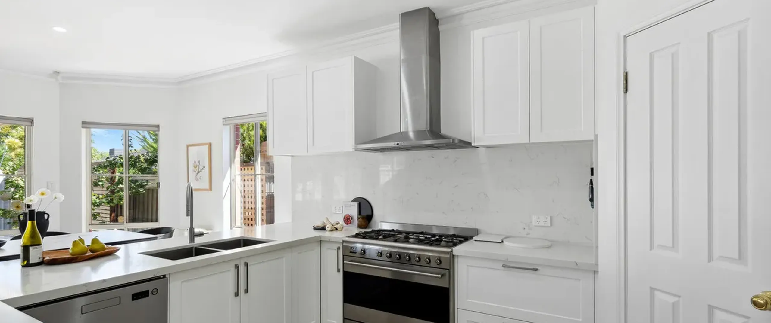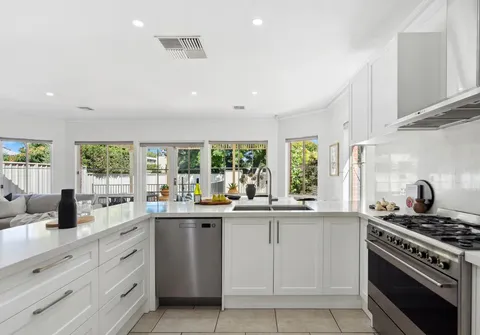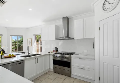 - Timeless white kitchen complemented by a suite of Smeg stainless-steel appliances, 2pac cabinetry, commercial grade rangehood, 6-burner gas cook top, plus ample storage and pantry with a breakfast bar