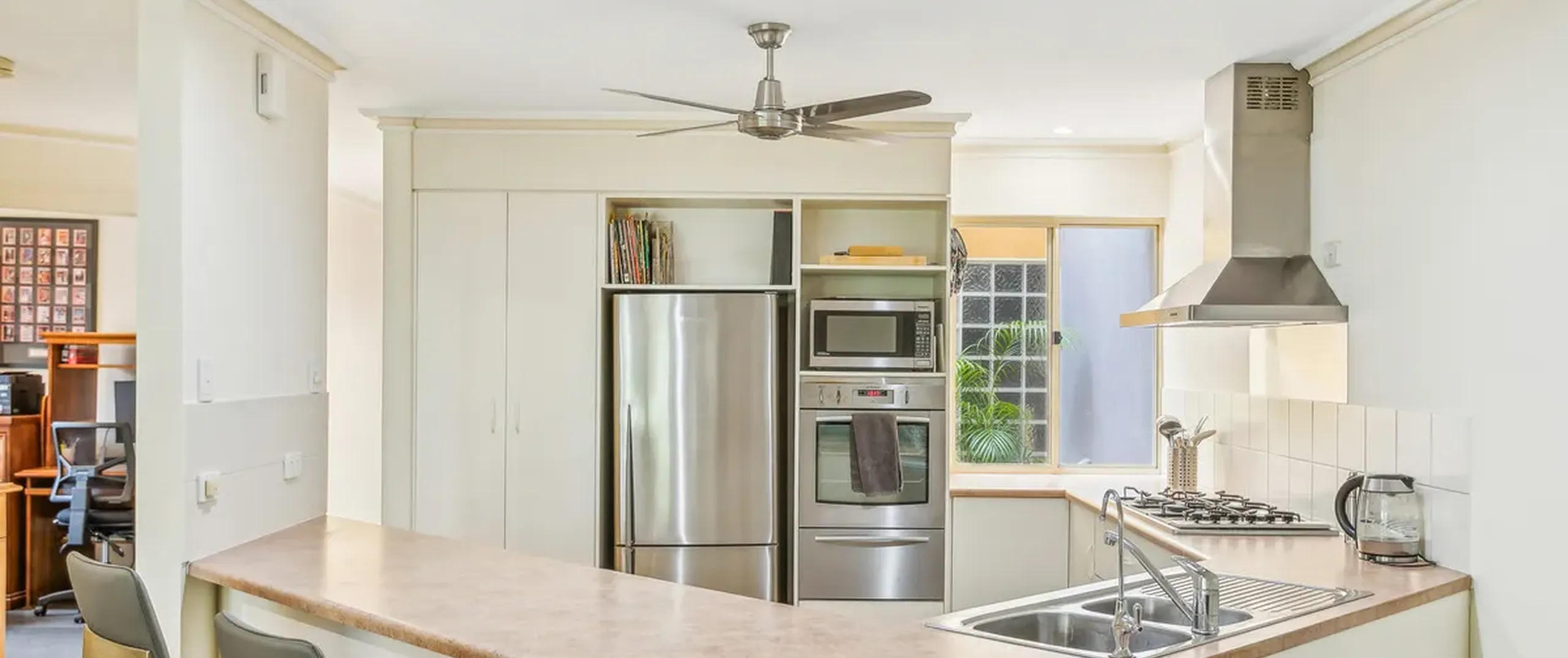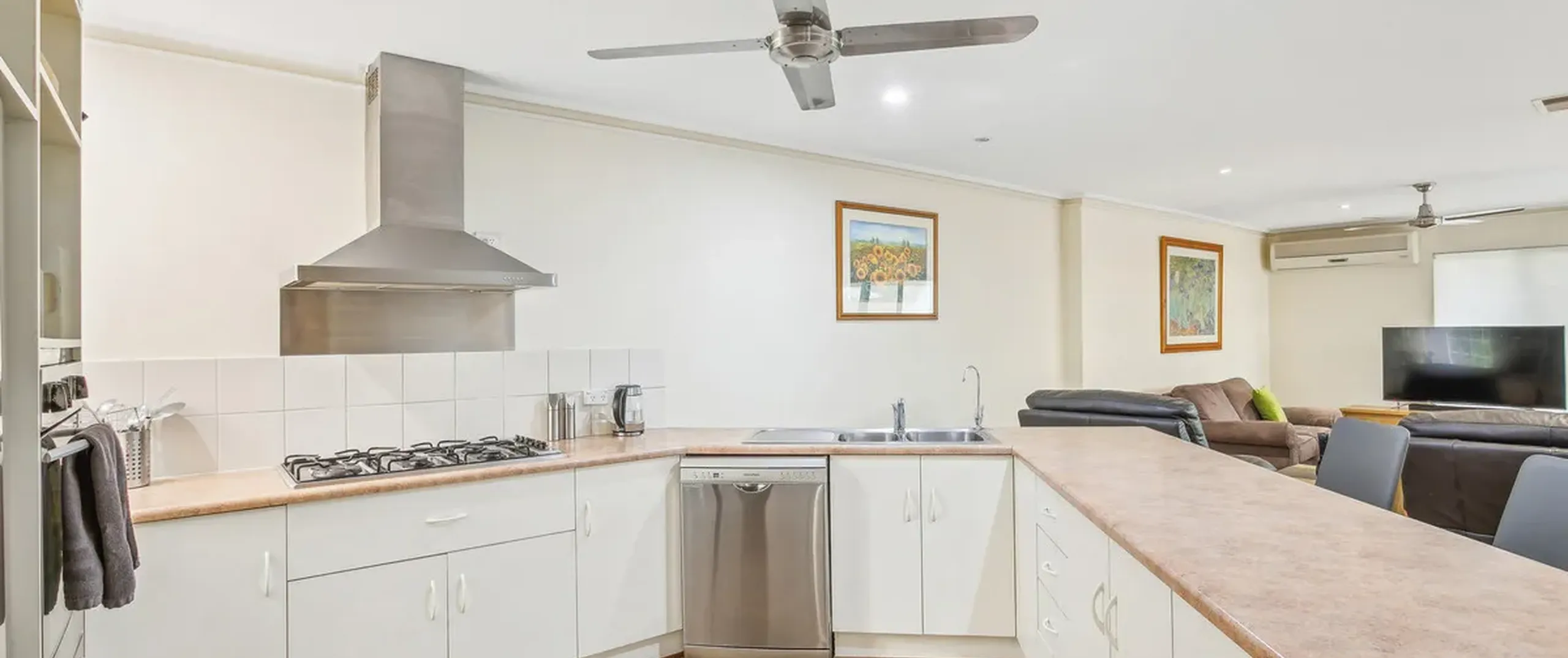 - Neutral kitchen complete with a 900mm gas cook top, dishwasher, and ample bench space