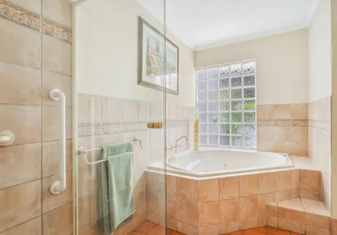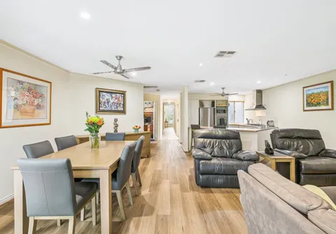 The inviting family and dining area is designed for both comfort and style, featuring ceiling fans and sliding doors that lead to a paved outdoor entertaining space. Here, you can host unforgettable gatherings or savor peaceful mornings, surrounded by a lush, established garden filled with beautifully cared-for plants and trees.
