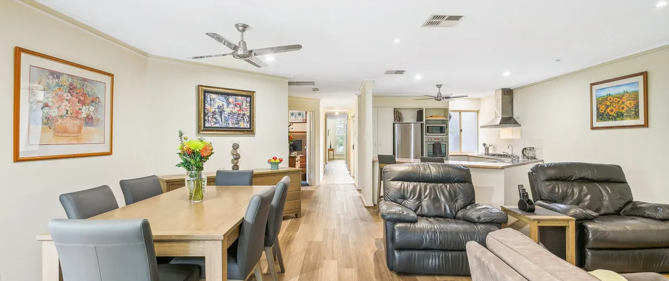 - Open plan family, dining and kitchen area with ceiling fans and seamless access to the outdoor courtyard