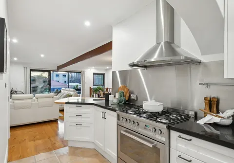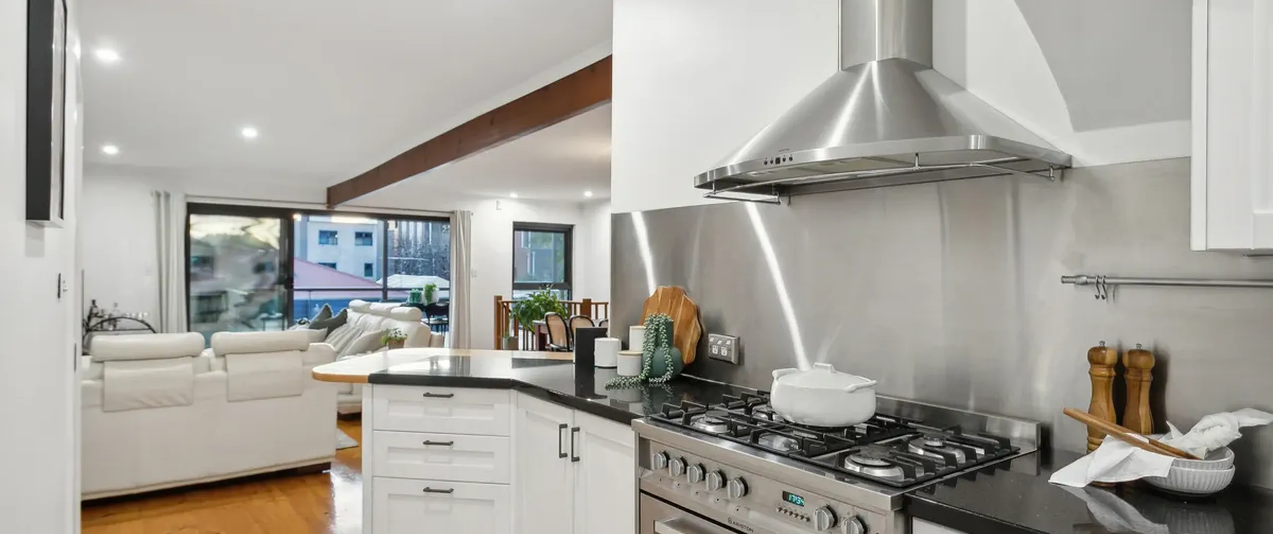 - JAG kitchen with granite benchtops, 800mm Ariston stove, Smeg rangehood, Miele dishwasher and breakfast bar