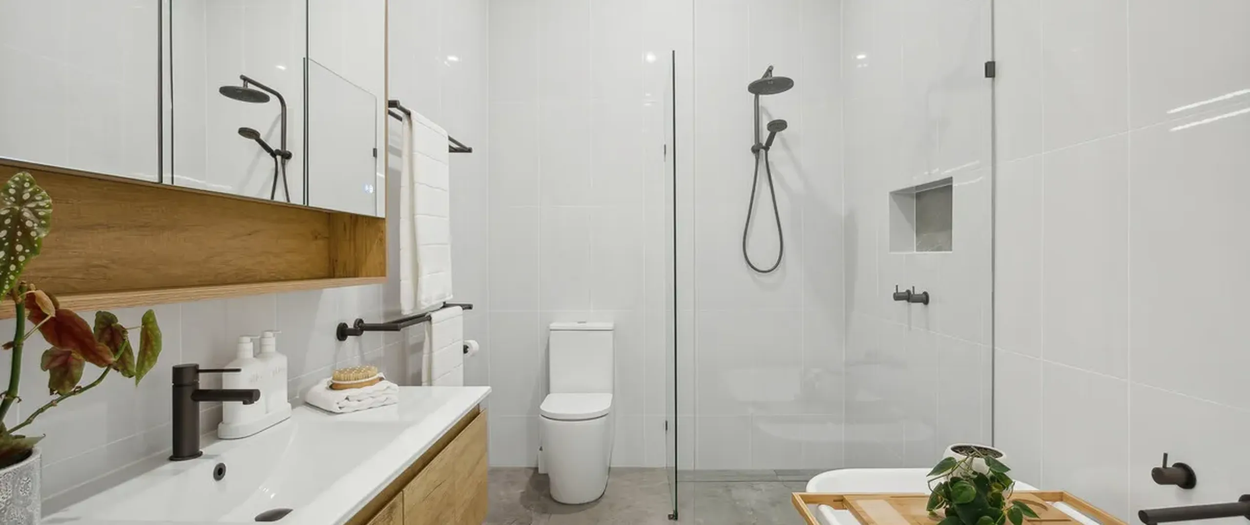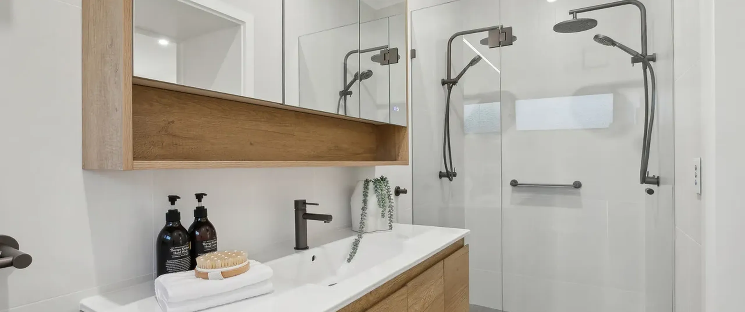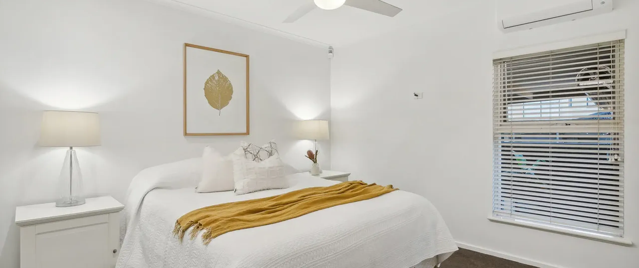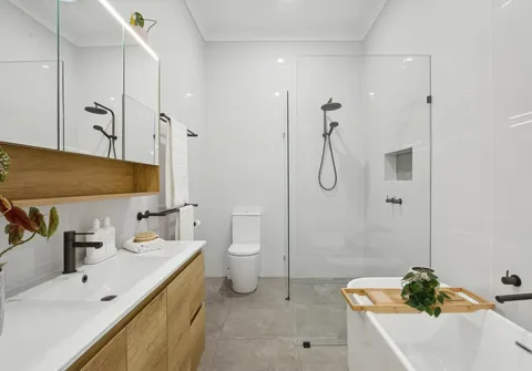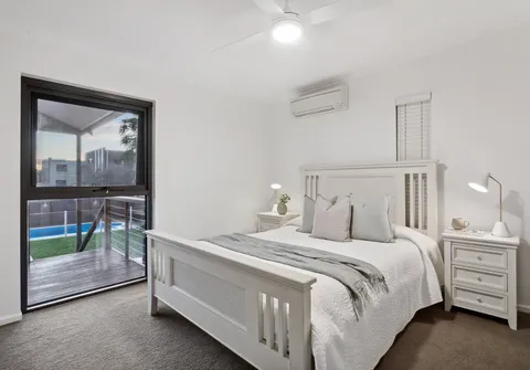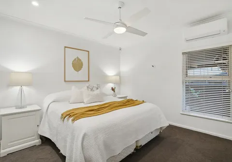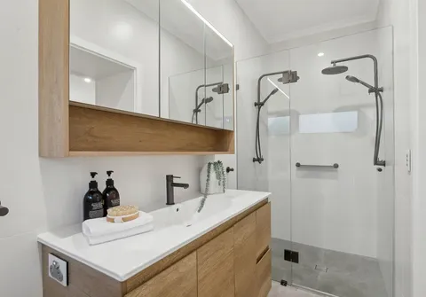 - Master bedroom with dual built-in robes, ceiling fan, split system air conditioning complemented by the modern ensuite with dual waterfall showerheads and ceiling to floor tiles