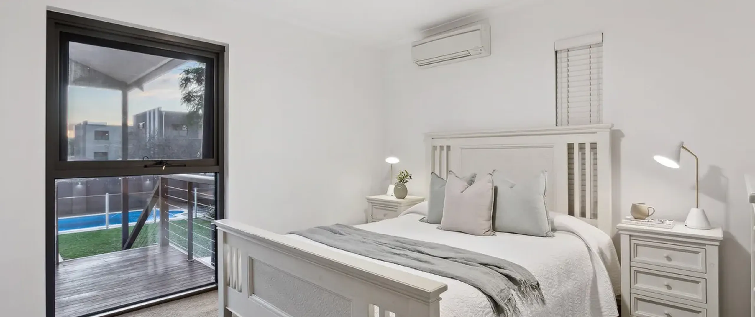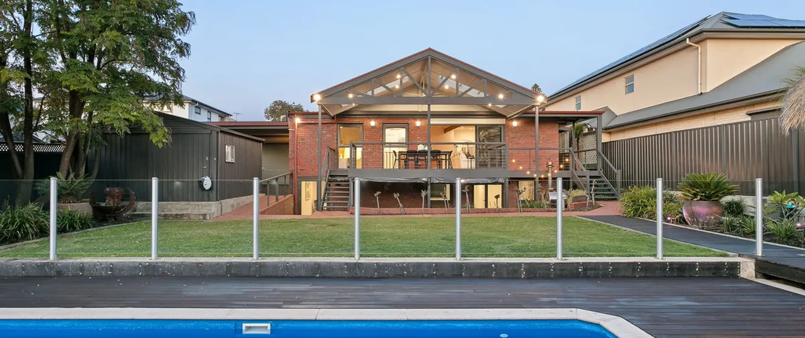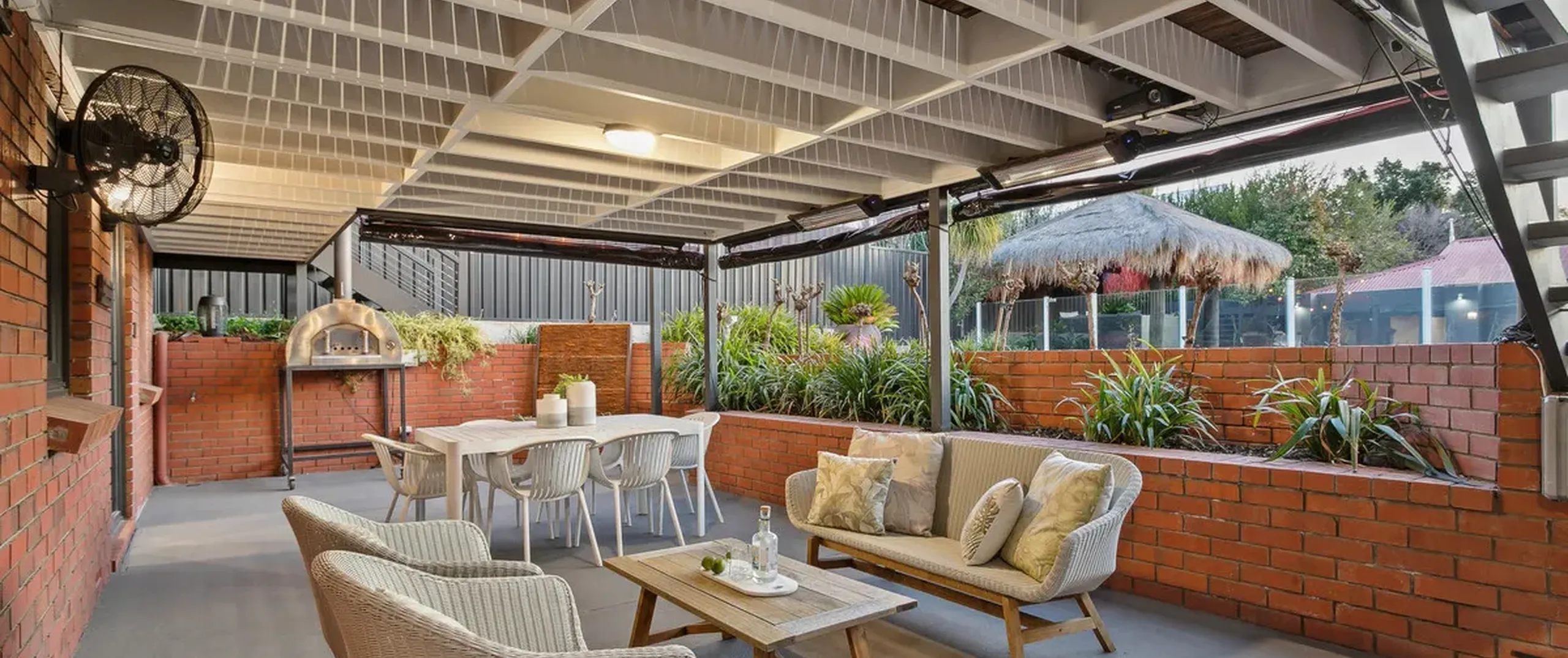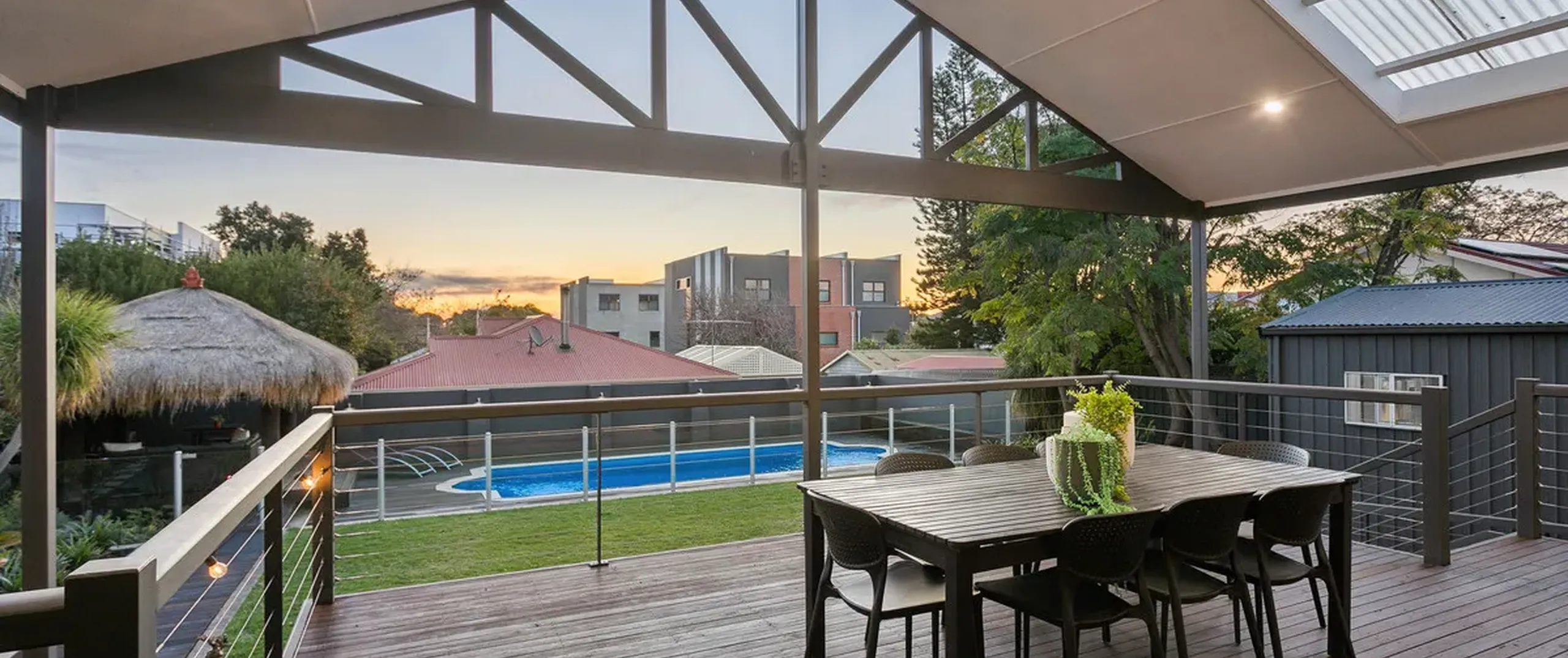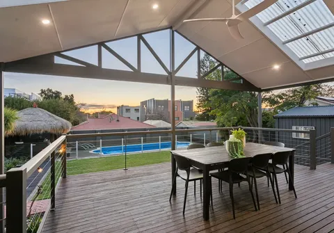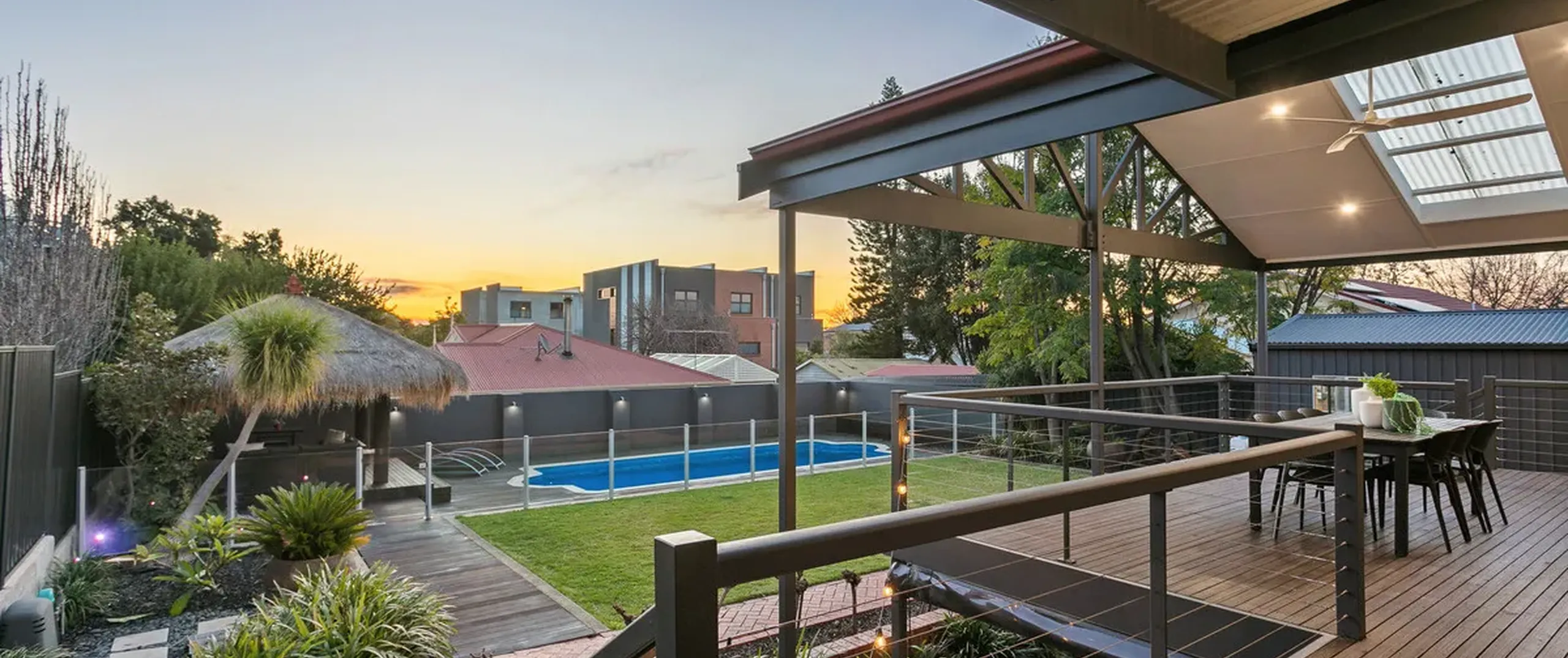 - Outside you can entertain in style under the pitched roof pergola on the large raised deck with a IP Rated Hunter Pacific Aqua fan and perfect views of the kids playing in the pool