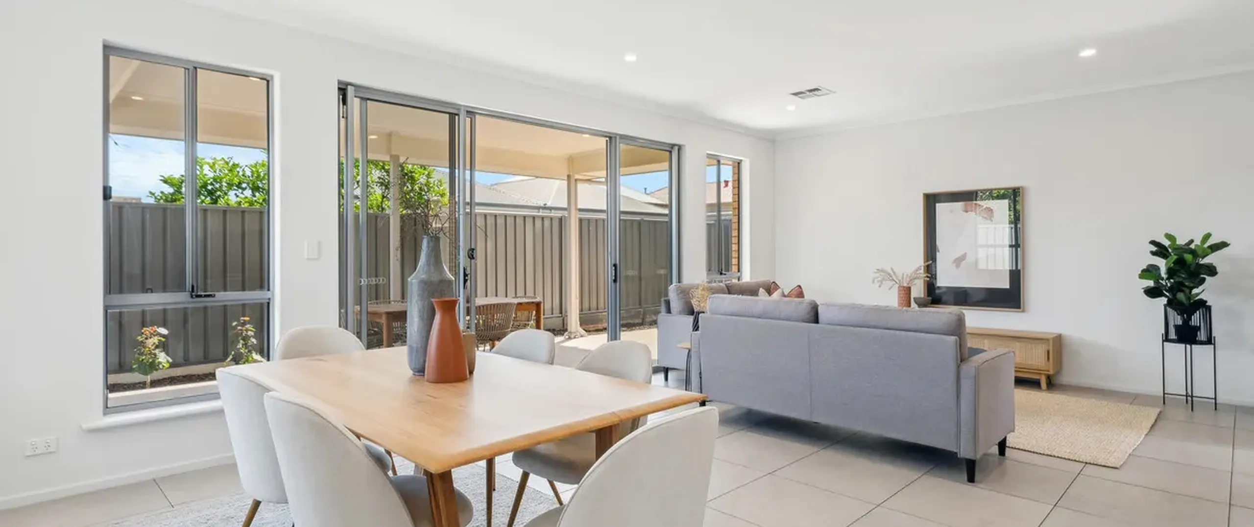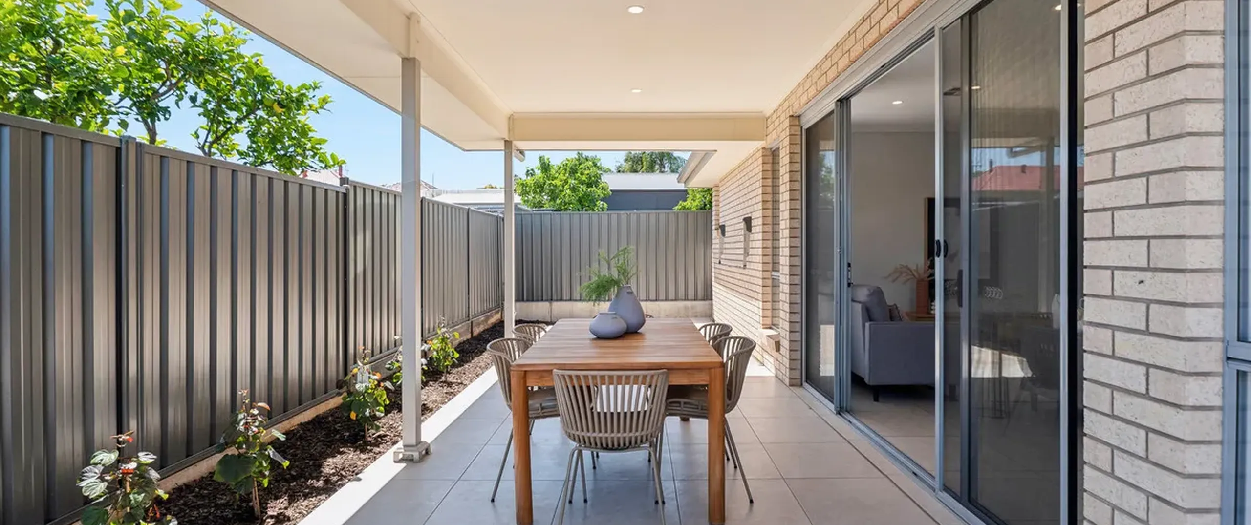 - Undercover entertaining area overlooking a low-maintenance backyard with plants