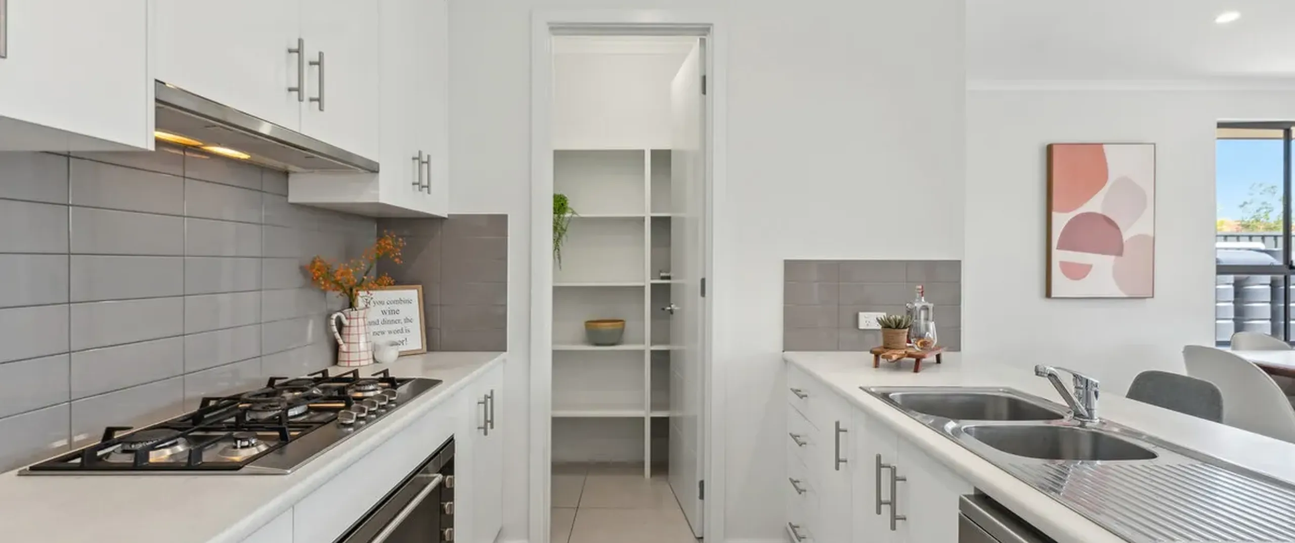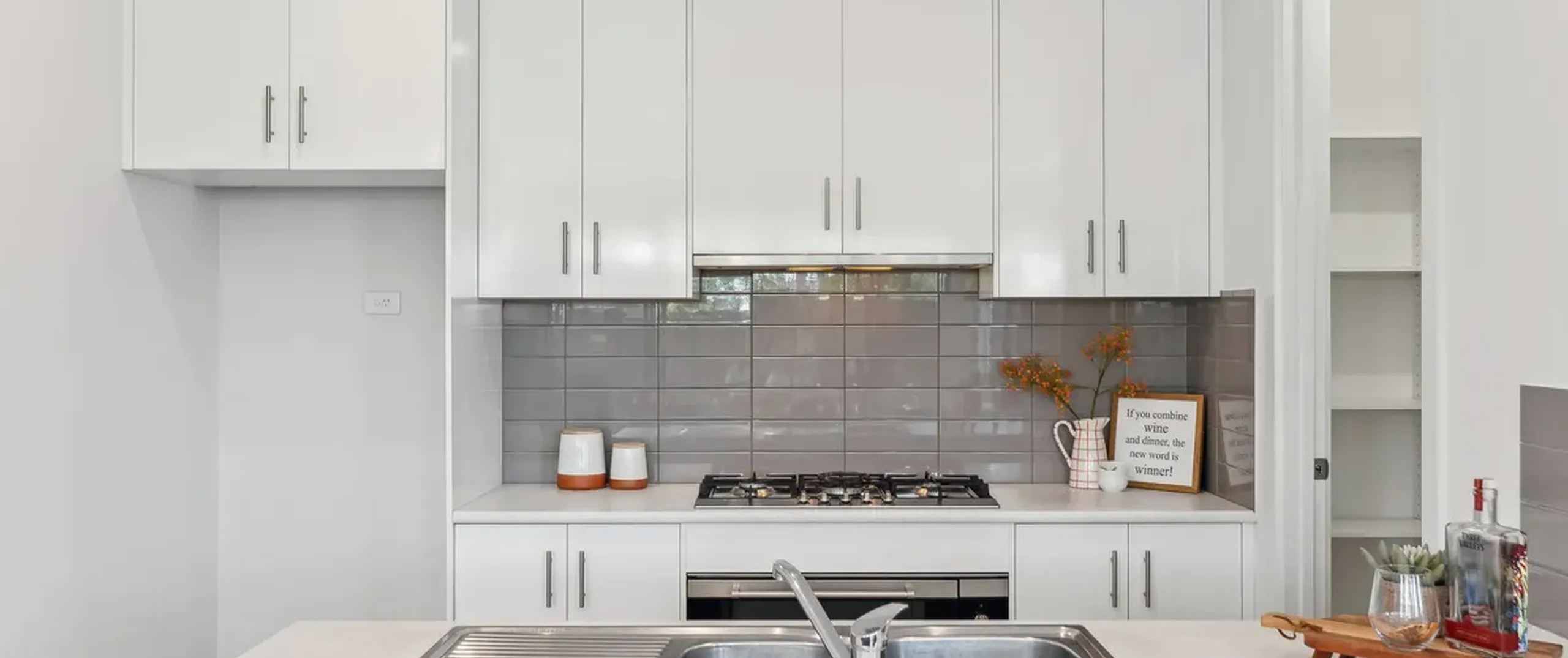 - Modern kitchen featuring stainless steel appliances, gas cooktop, dishwasher, abundant cupboard space, and sweeping benchtops
