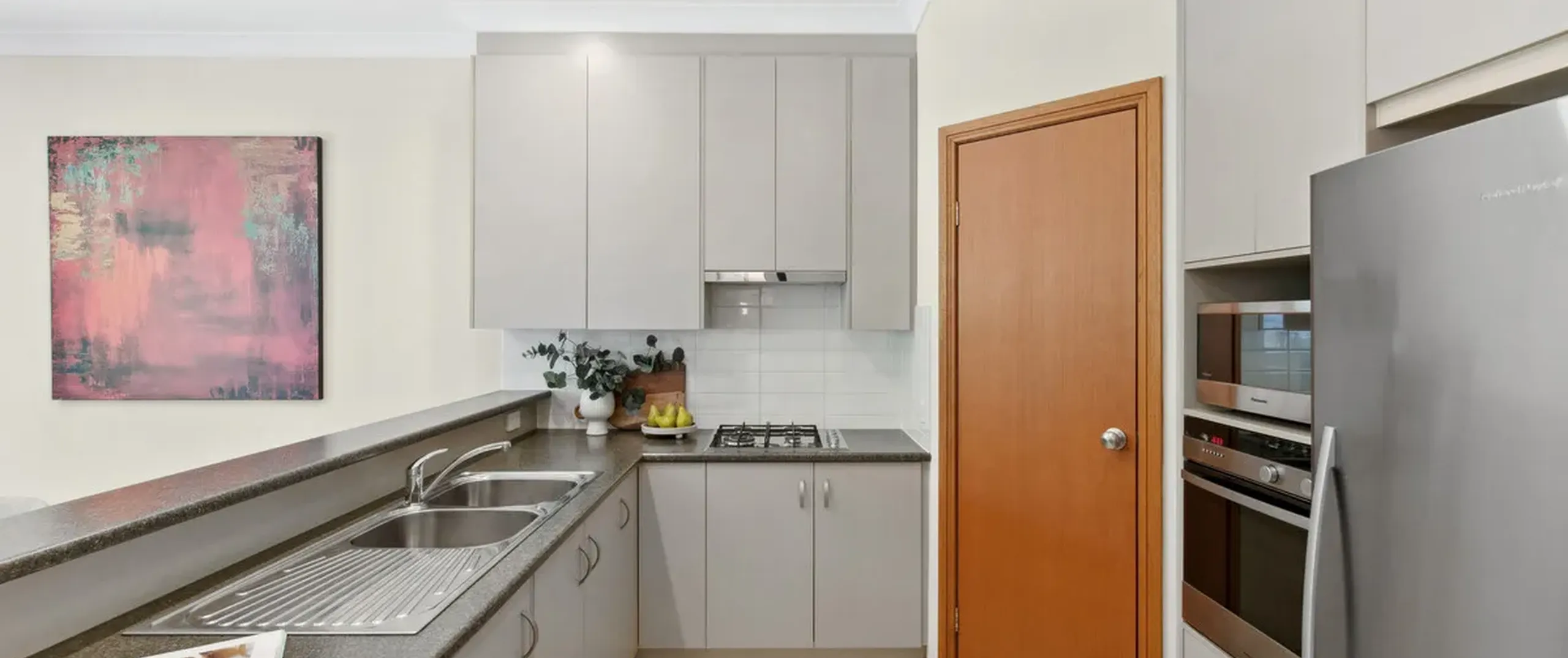 - Kitchen complemented by a gas cook top and ample storage including a pantry