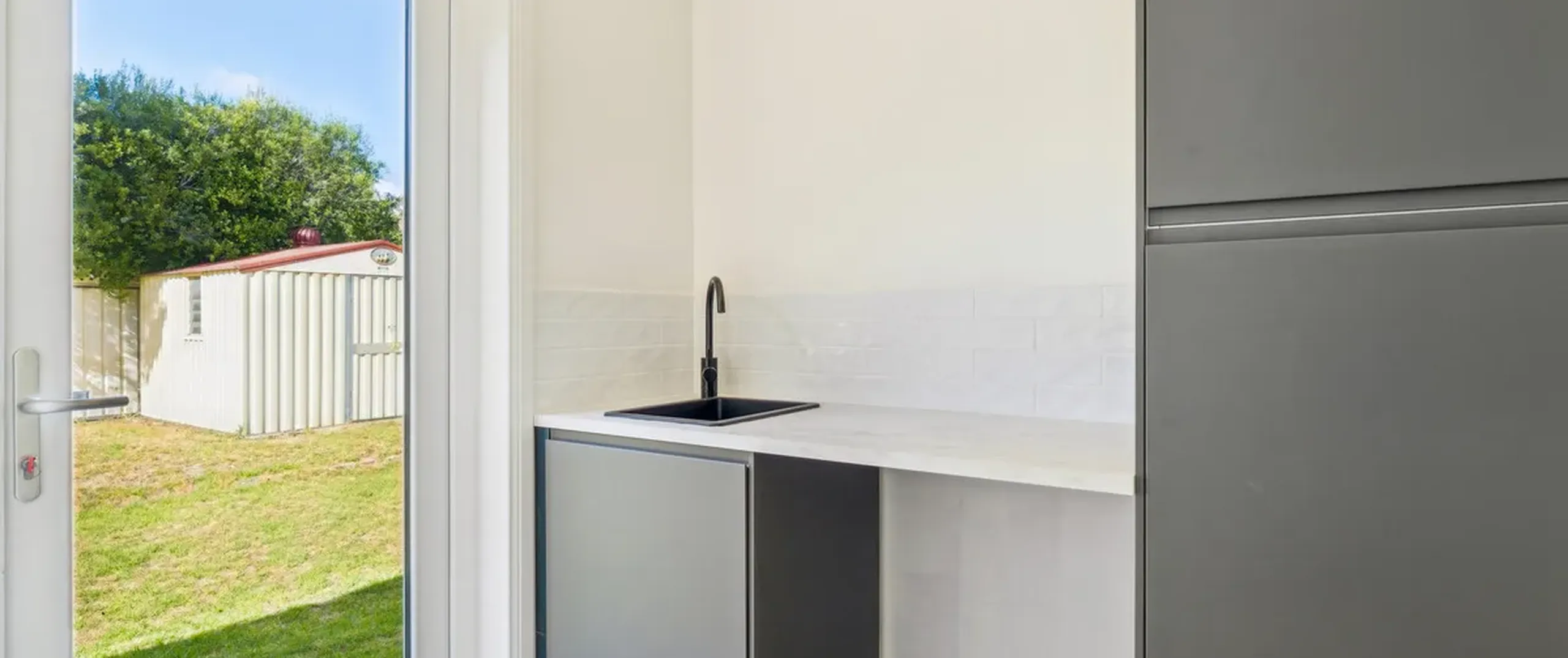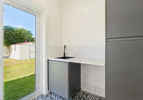 - Renovated laundry with on-trend tiles, built-in cabinetry, and direct external access
