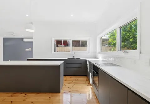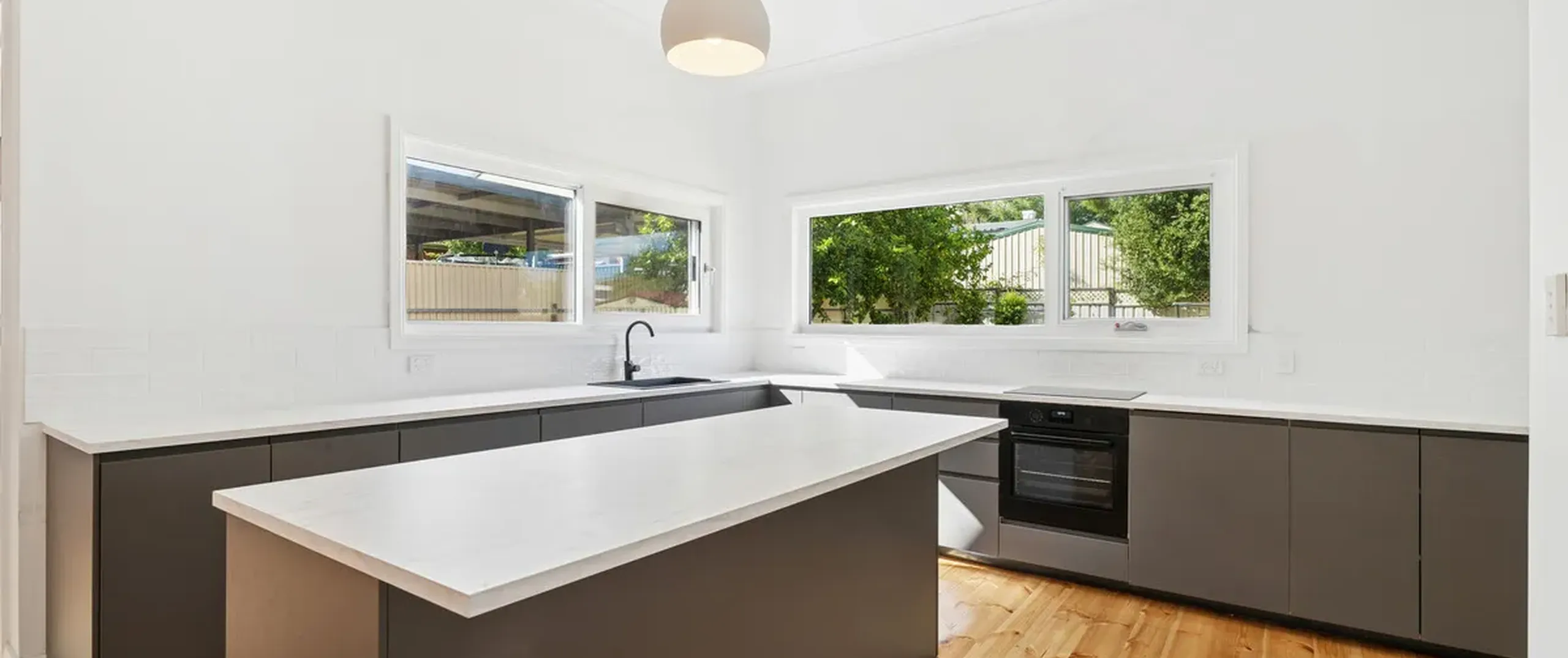 - Modern kitchen with sleek, sweeping benchtops, modern cabinetry, and large island bench